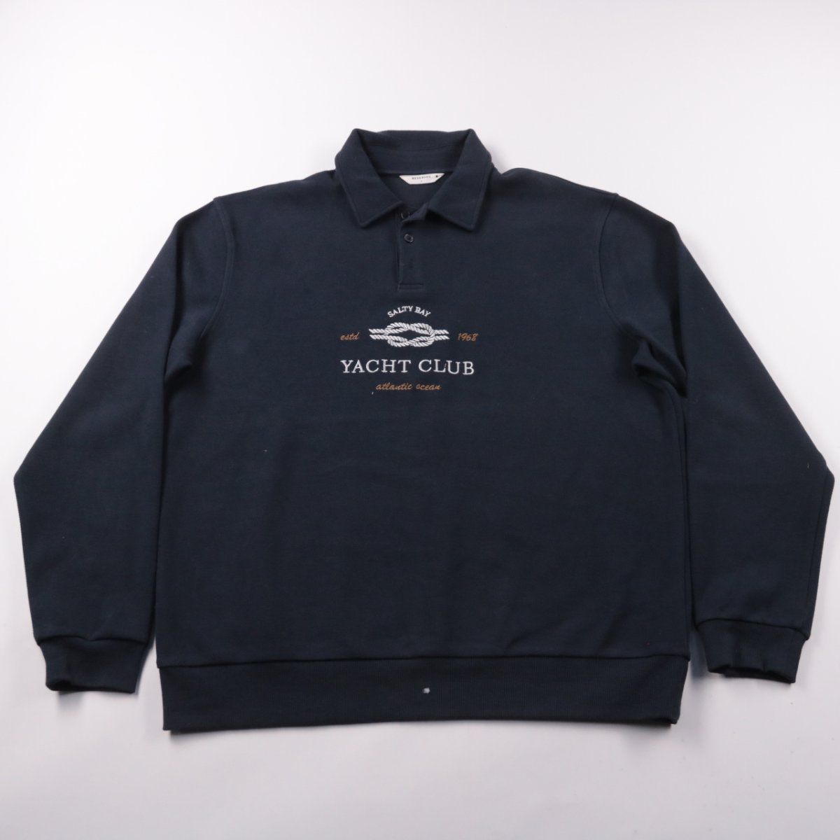 Мужское поло Reserved тёмно-синего цвета с длинным рукавом и вышитым принтом Yacht Club на груди. Подойдёт для повседневной носки в городе и на отдыхе, хорошо сочетается с джинсами и чиносами. Практичный материал с добавлением эластана даёт комфортную посадку и меньше мнётся.