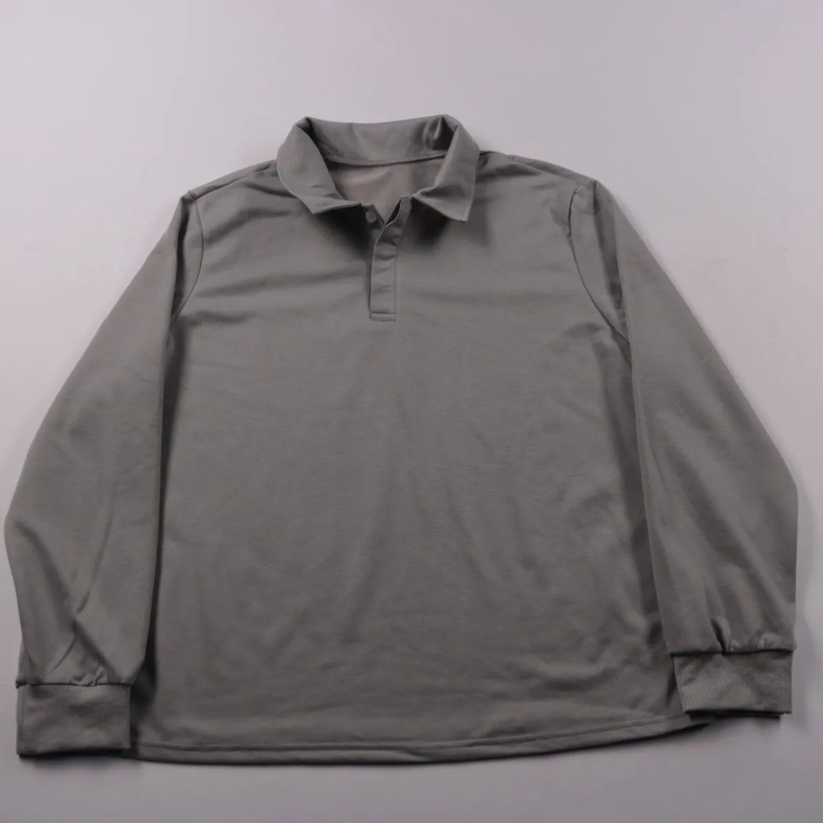 Мужское поло с длинным рукавом в сером цвете, без видимого бренда. Подойдёт для повседневной носки и офисного casual благодаря воротнику и лаконичному дизайну. Ткань эластичная (полиэстер со спандексом), быстро сохнет и меньше мнётся.
