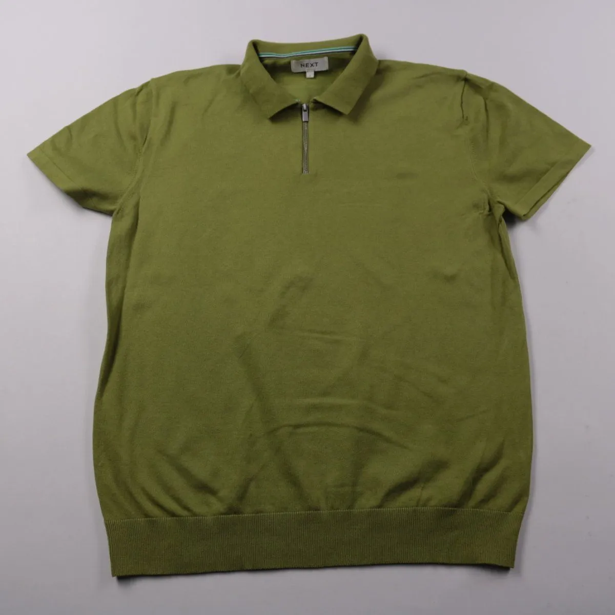 Мужское поло Next оливкового цвета с коротким рукавом и застёжкой-молнией у воротника. Подойдёт для повседневной носки и офисного casual в тёплую погоду. Практичный трикотажный материал хорошо держит форму и удобно сидит.