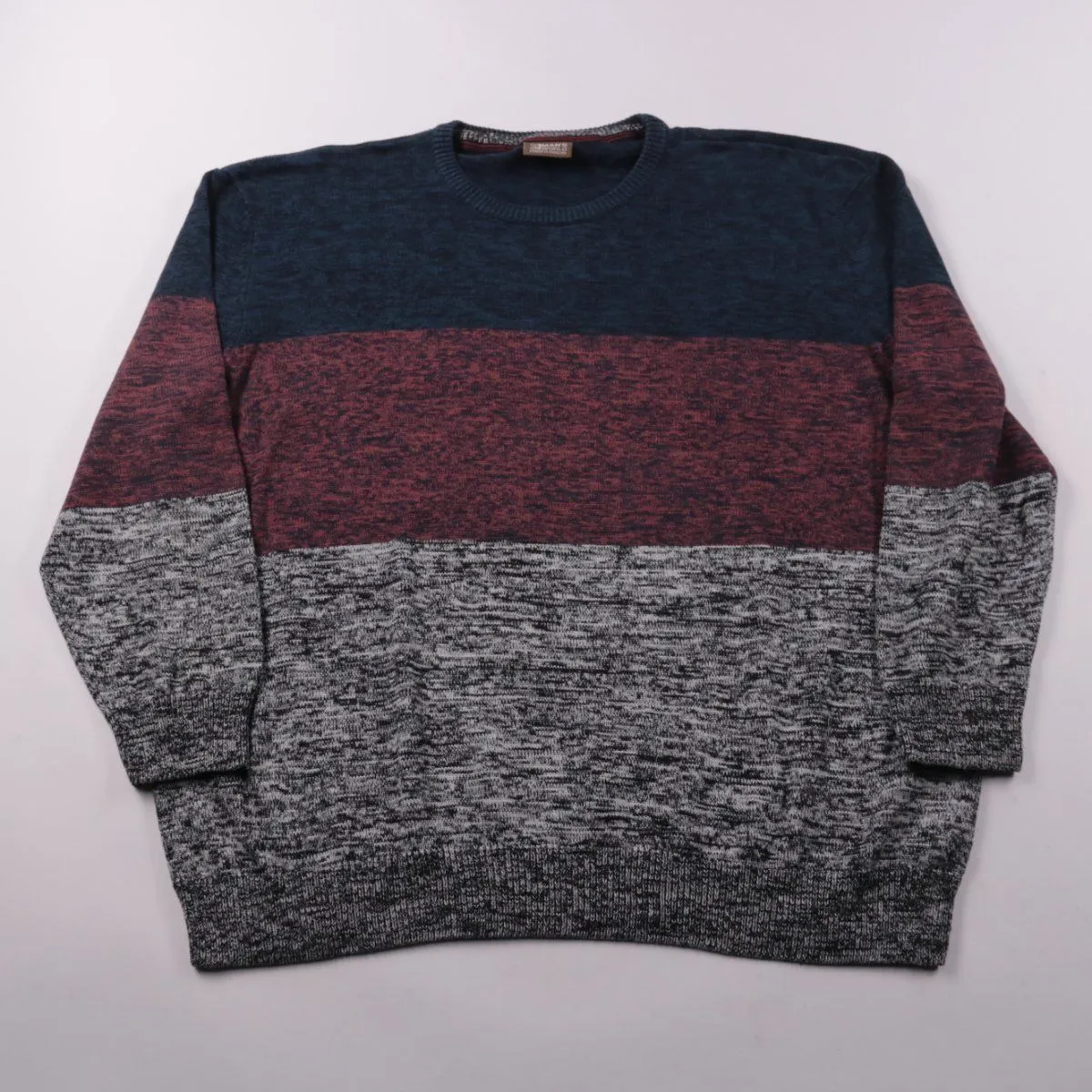 Мужской вязаный джемпер MAN'S WORLD с круглым вырезом и цветными блоками (тёмно-синий, бордовый и серый меланж). Подойдёт для повседневной носки в прохладную погоду и хорошо сочетается с джинсами. Смесь хлопка и акрила делает его более практичным в уходе и носке.