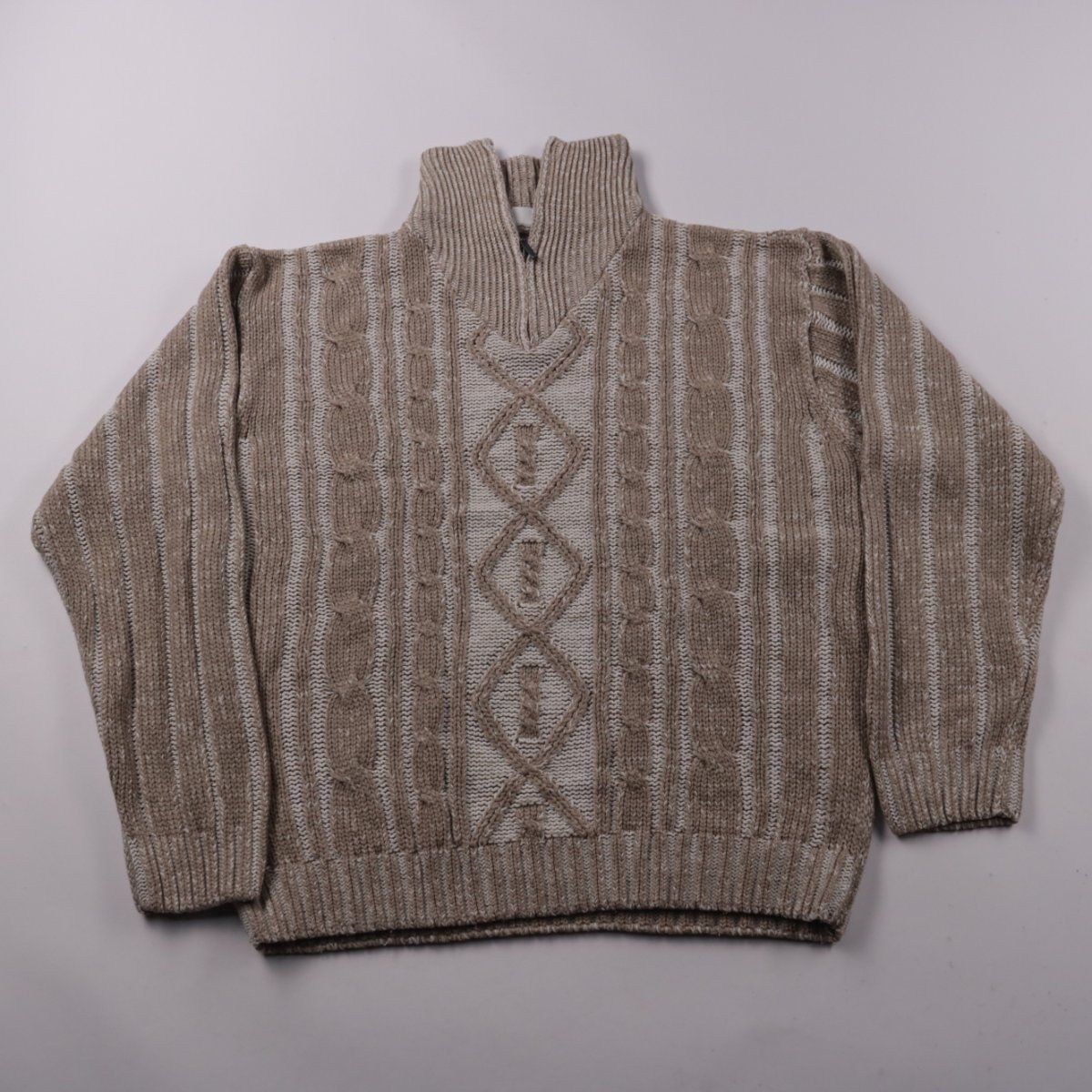 Мужской вязаный свитер Canda с высоким воротником на молнии и фактурной вязкой с косами и полосками. Подойдёт для прохладной погоды, повседневной носки и прогулок. Молния на воротнике позволяет удобно регулировать посадку и теплообмен.