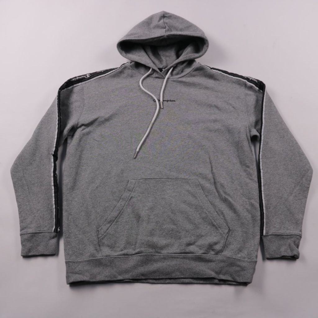 Мужское худи Champion серого меланжа с капюшоном и карманом-кенгуру, с фирменными лампасами по линии плеч. Подойдёт для повседневной носки и прогулок в прохладную погоду. Мягкий трикотаж с хлопком хорошо дышит и комфортен в носке.
