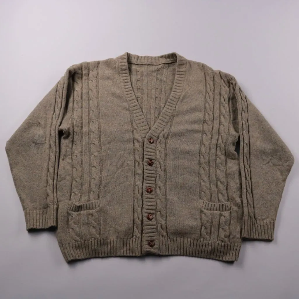 Вязаный кардиган с V-образным вырезом и застёжкой на пуговицы, с рельефным узором «косы» и накладными карманами. Подойдёт для повседневной носки в прохладную погоду, удобно надевать поверх футболки или рубашки. Практичный за счёт плотной вязки и карман...