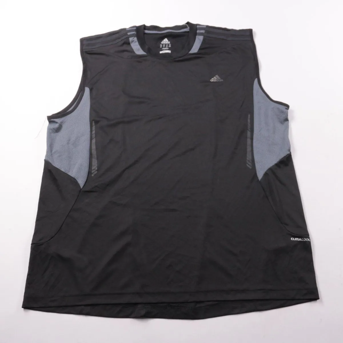 Мужская спортивная майка Adidas ClimaCool, чёрная с серыми сетчатыми вставками по бокам. Подойдёт для тренировок, бега и зала в тёплую погоду благодаря вентиляции. Быстро сохнет и хорошо отводит влагу.