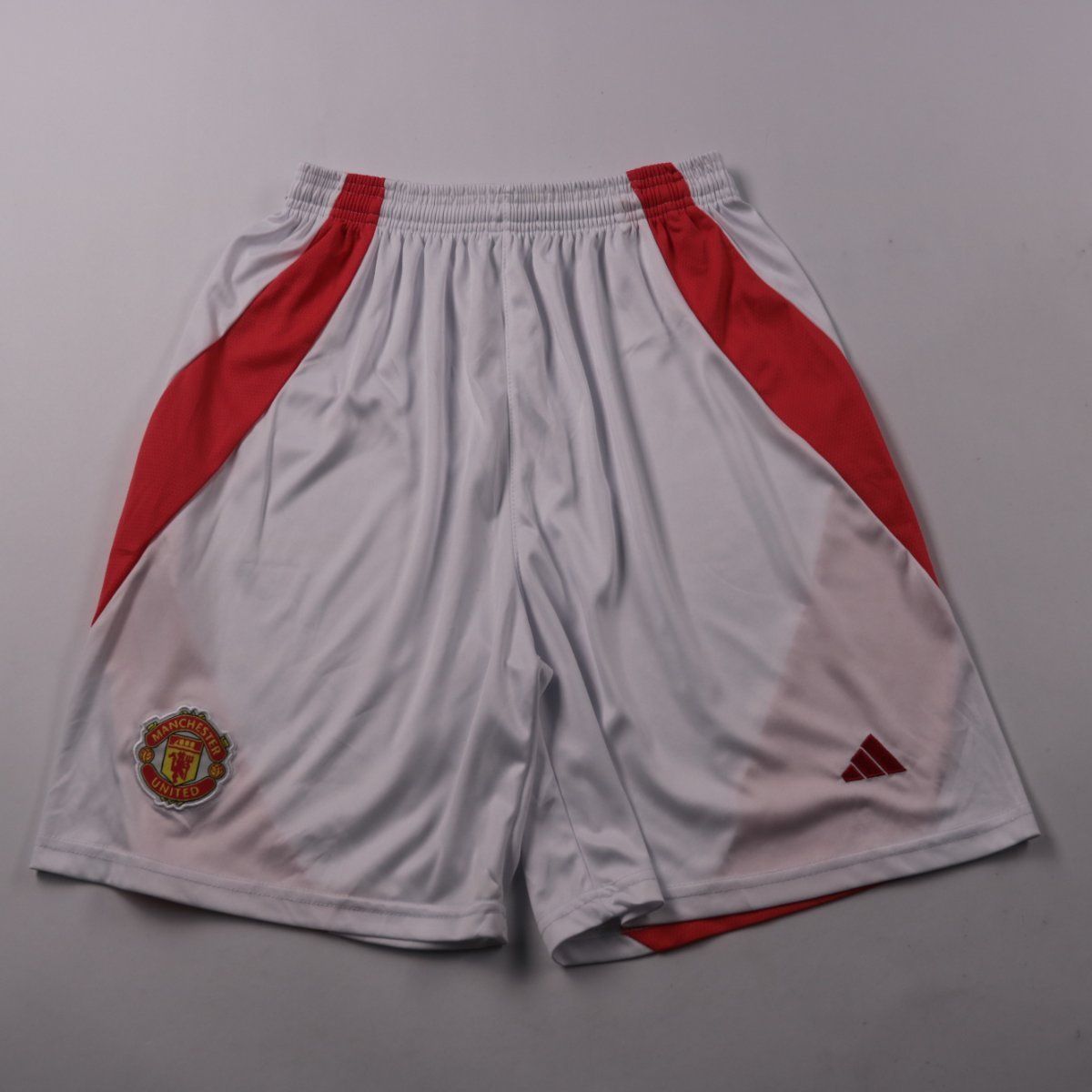 Мужские спортивные шорты Adidas белого цвета с красными вставками, с эмблемой Manchester United и логотипом бренда. Подойдут для футбола, тренировок и активного отдыха в тёплую погоду. Лёгкая синтетическая ткань быстро сохнет и комфортно носится.