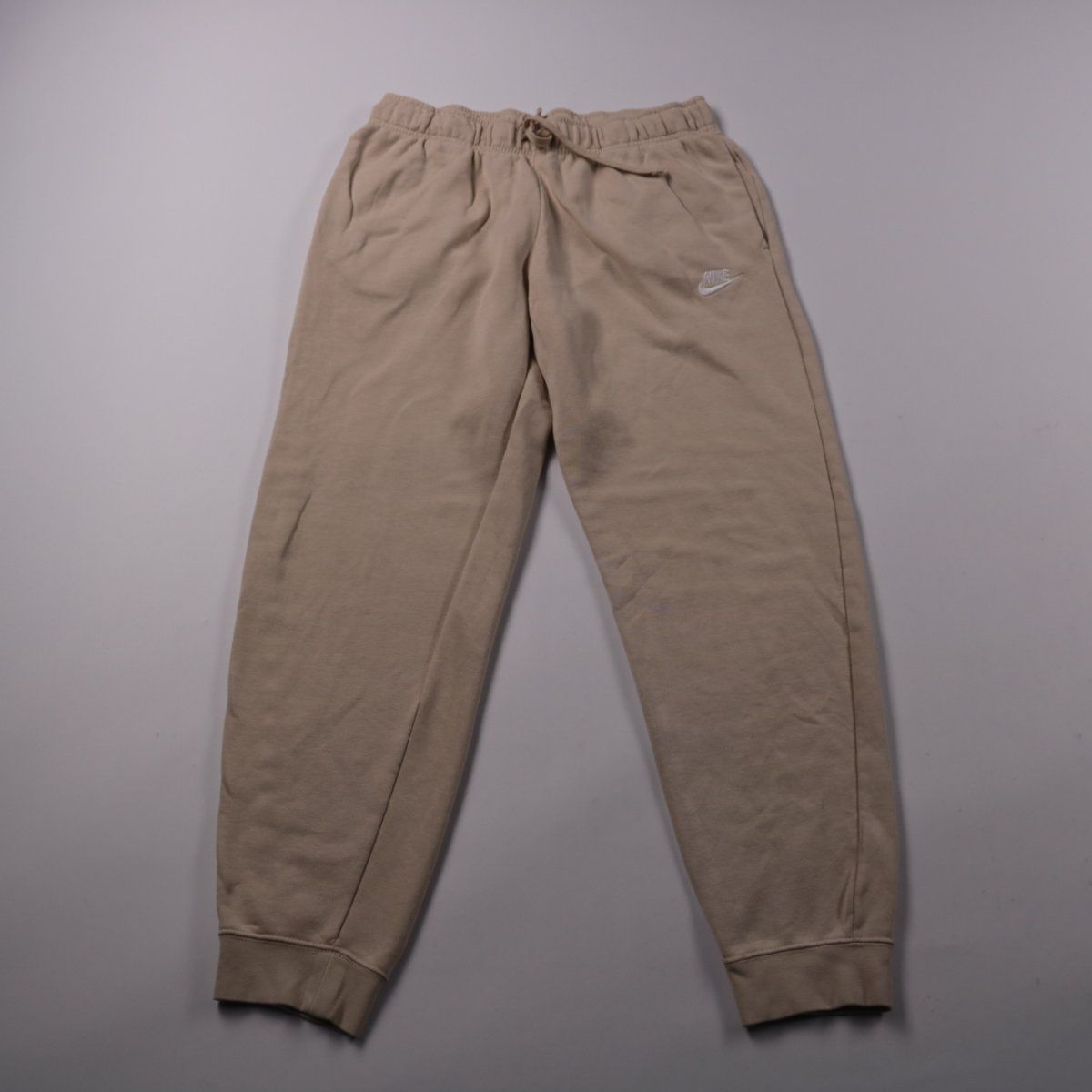 Спортивные брюки Nike в бежевом цвете с эластичным поясом на шнурке и манжетами снизу. Подойдут для повседневной носки, прогулок и лёгких тренировок в прохладную погоду. Мягкий трикотаж комфортно сидит и не сковывает движения.