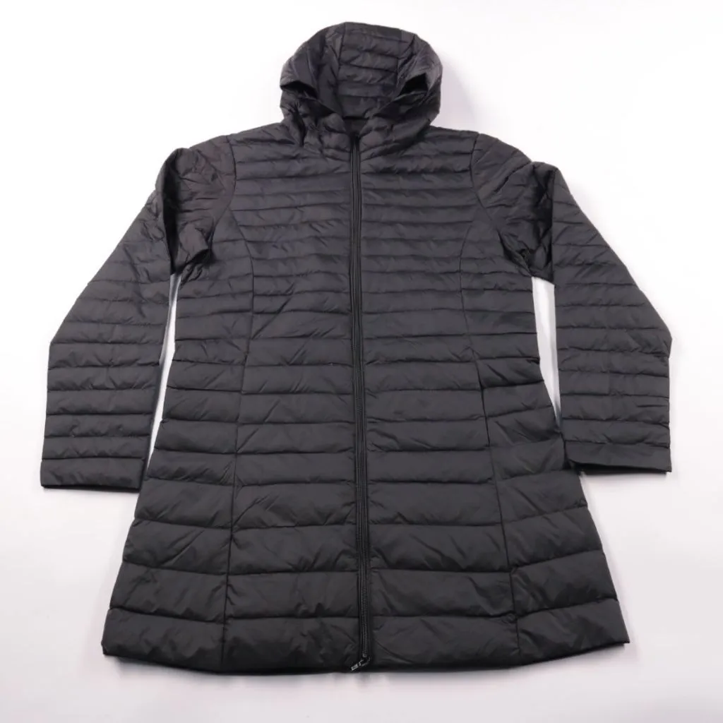 Удлинённая стёганая куртка с капюшоном и застёжкой на молнию, бренд не указан. Подойдёт для прохладной погоды в межсезонье и на каждый день, хорошо смотрится с джинсами и брюками. Практичный плюс — лёгкая и не сковывает движения.