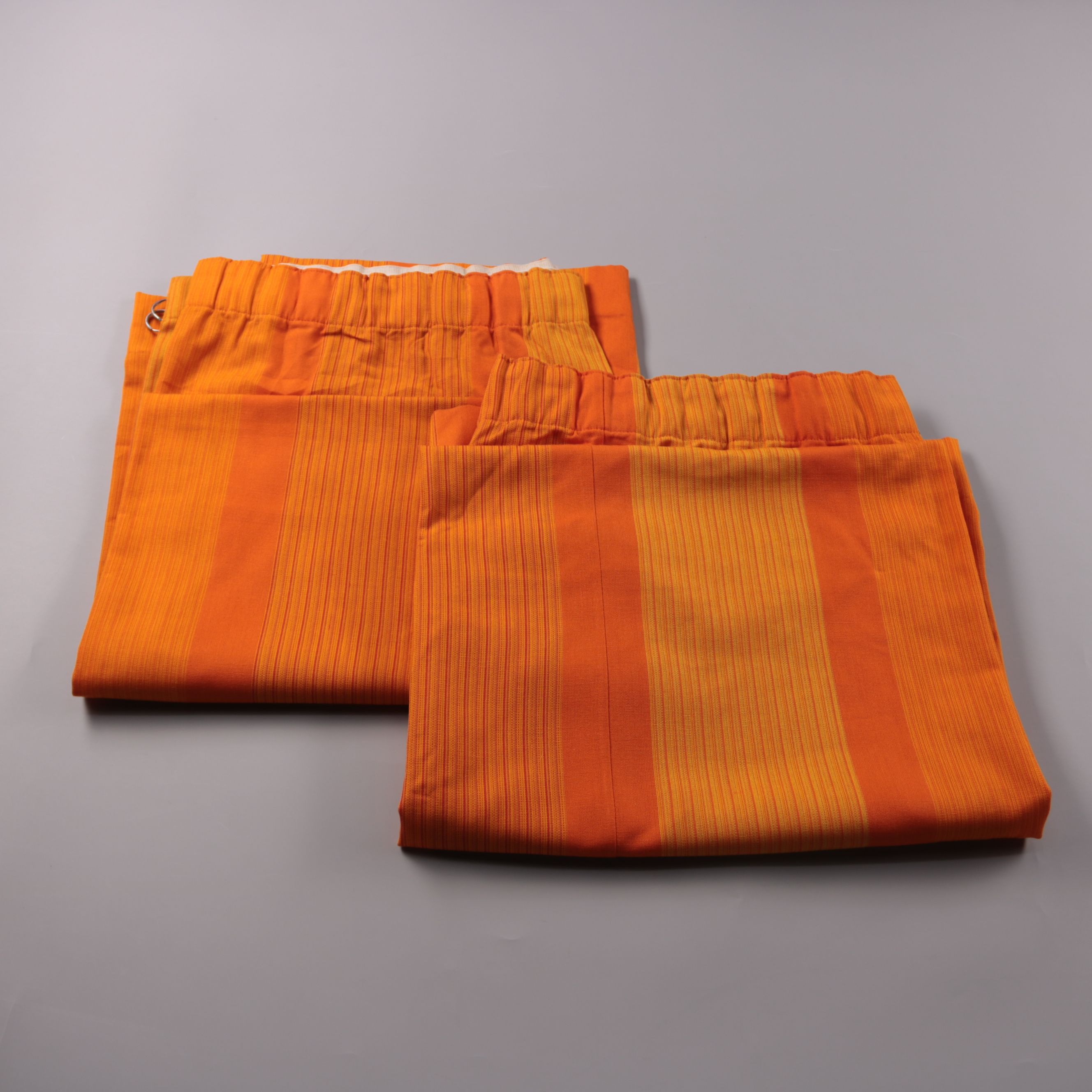 Оранжевые шторы в полоску с креплением на металлических кольцах. Подойдут для кухни или гостиной, чтобы добавить теплый акцент и слегка приглушить свет. Кольца быстро надеваются на карниз и ткань легко драпируется складками.