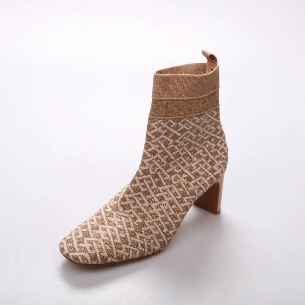 Женские ботильоны-«носок» из трикотажа с бежево-коричневым узором и эластичным верхом. Подойдут для демисезонной погоды и повседневных образов с брюками или юбками. Устойчивый каблук и облегающий голенище дают комфортную посадку и их легко надевать.