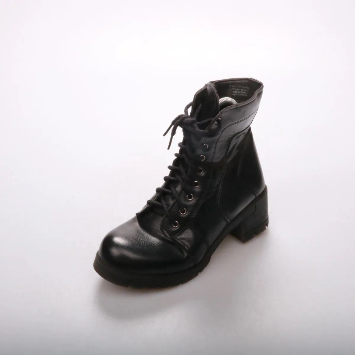 Женские ботинки на шнуровке с боковой молнией, без указания бренда. Подойдут на каждый день в демисезон, хорошо сочетаются с джинсами и брюками. Устойчивая подошва с выраженным протектором даёт лучшее сцепление на мокром асфальте.