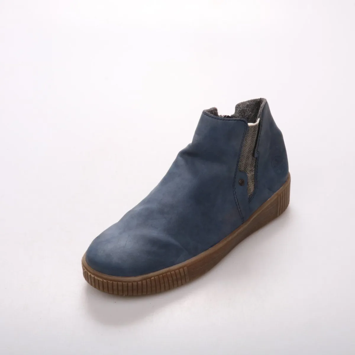 Женские демисезонные ботинки Rieker в синем цвете на устойчивой коричневой подошве, с боковой молнией для удобного надевания. Подойдут для повседневных прогулок и города в прохладную погоду. Практичный плюс — нескользящая рельефная подошва.