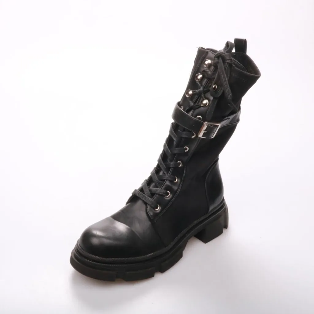 Женские чёрные ботинки на шнуровке с боковой молнией и ремешком с пряжкой, на массивной тракторной подошве. Подойдут для повседневной носки в городе в прохладную погоду и хорошо сочетаются с джинсами и платьями. Плотная подошва даёт устойчивость и лучш...