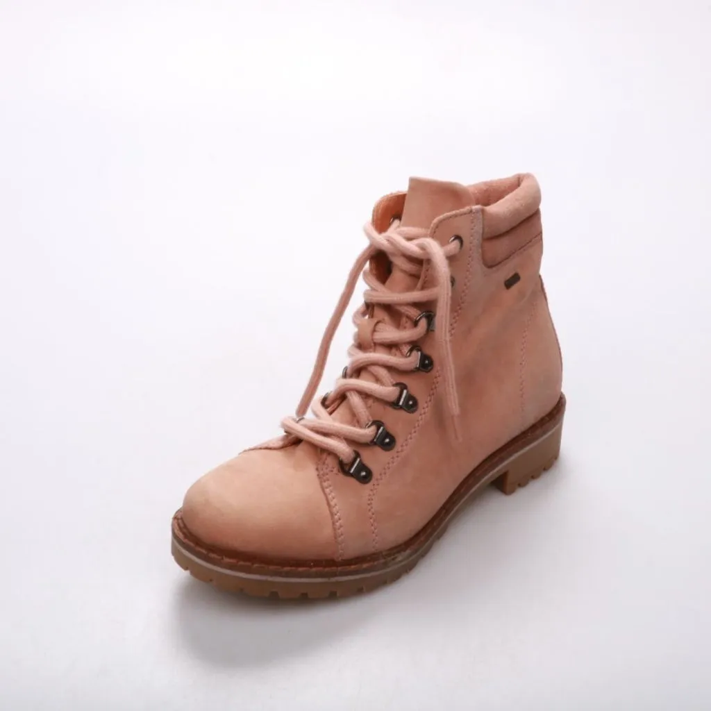 Женские ботинки на шнуровке в бежево-розовом оттенке с рельефной подошвой. Подойдут для повседневной носки в межсезонье и прохладную погоду. Практичное преимущество — устойчивый каблук и протектор, который лучше держит на мокром покрытии.