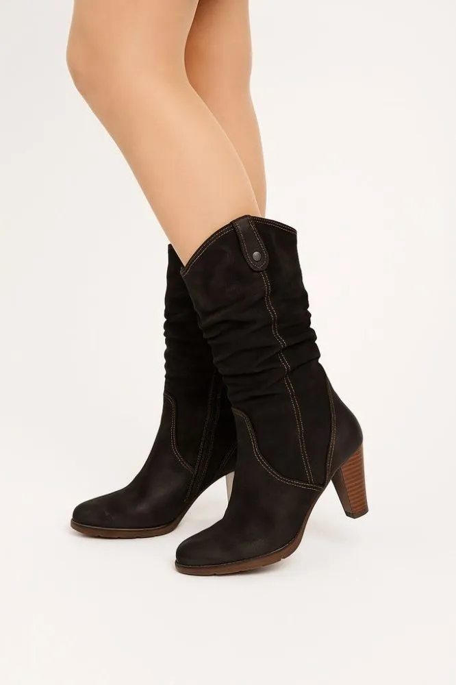 Женские сапоги Paul Green из чёрной натуральной замши с присборенным голенищем и устойчивым каблуком. Подойдут для демисезона и городских образов с платьями, юбками и джинсами. Удобно надевать и снимать благодаря боковой молнии.