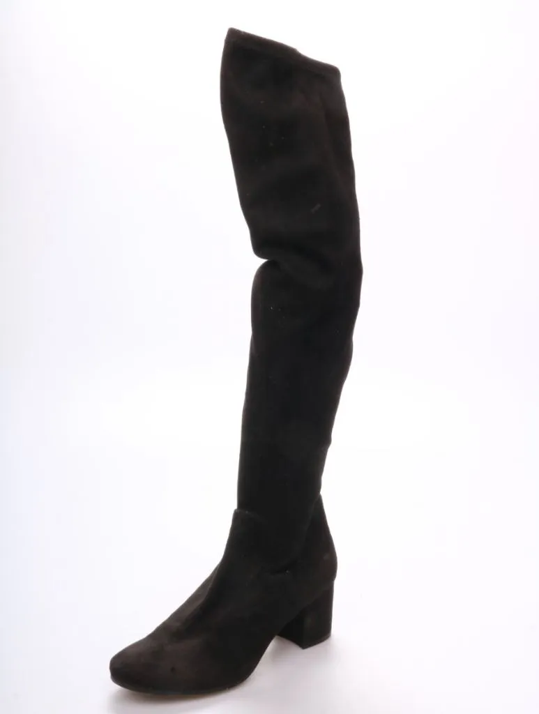 Высокие сапоги H&M выше колена из мягкого материала под замшу на устойчивом каблуке. Подойдут для повседневных осенне-весенних образов с платьями, юбками и узкими джинсами. Практичный плюс — широкое голенище без лишнего декора легко сочетать с базовой ...