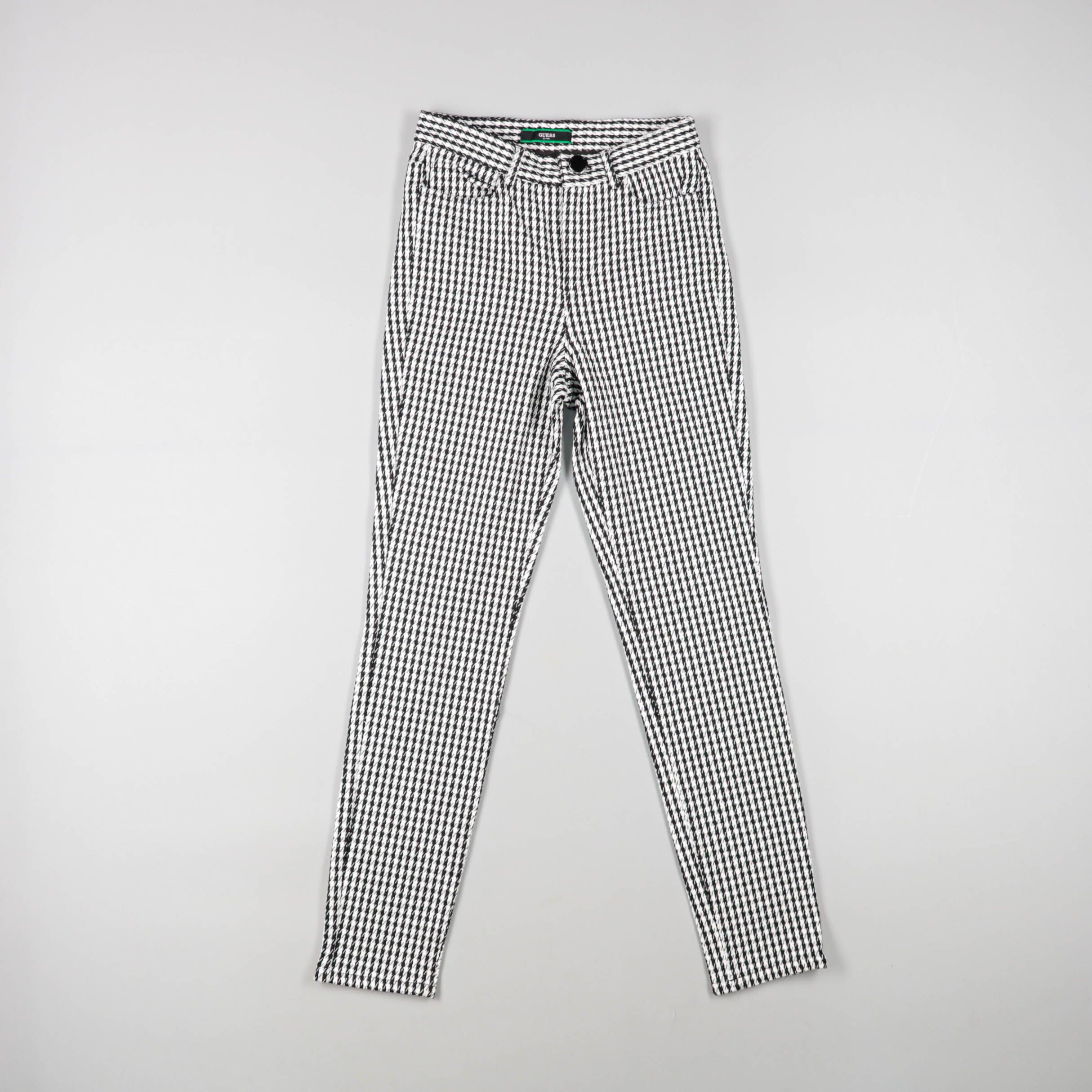Женские брюки Guess в чёрно-белую «гусиную лапку», зауженного кроя с посадкой на талии и шлёвками под ремень. Подойдут для офиса и повседневных образов с однотонными свитерами или рубашками. Плотная ткань держит форму и выглядит аккуратно весь день.