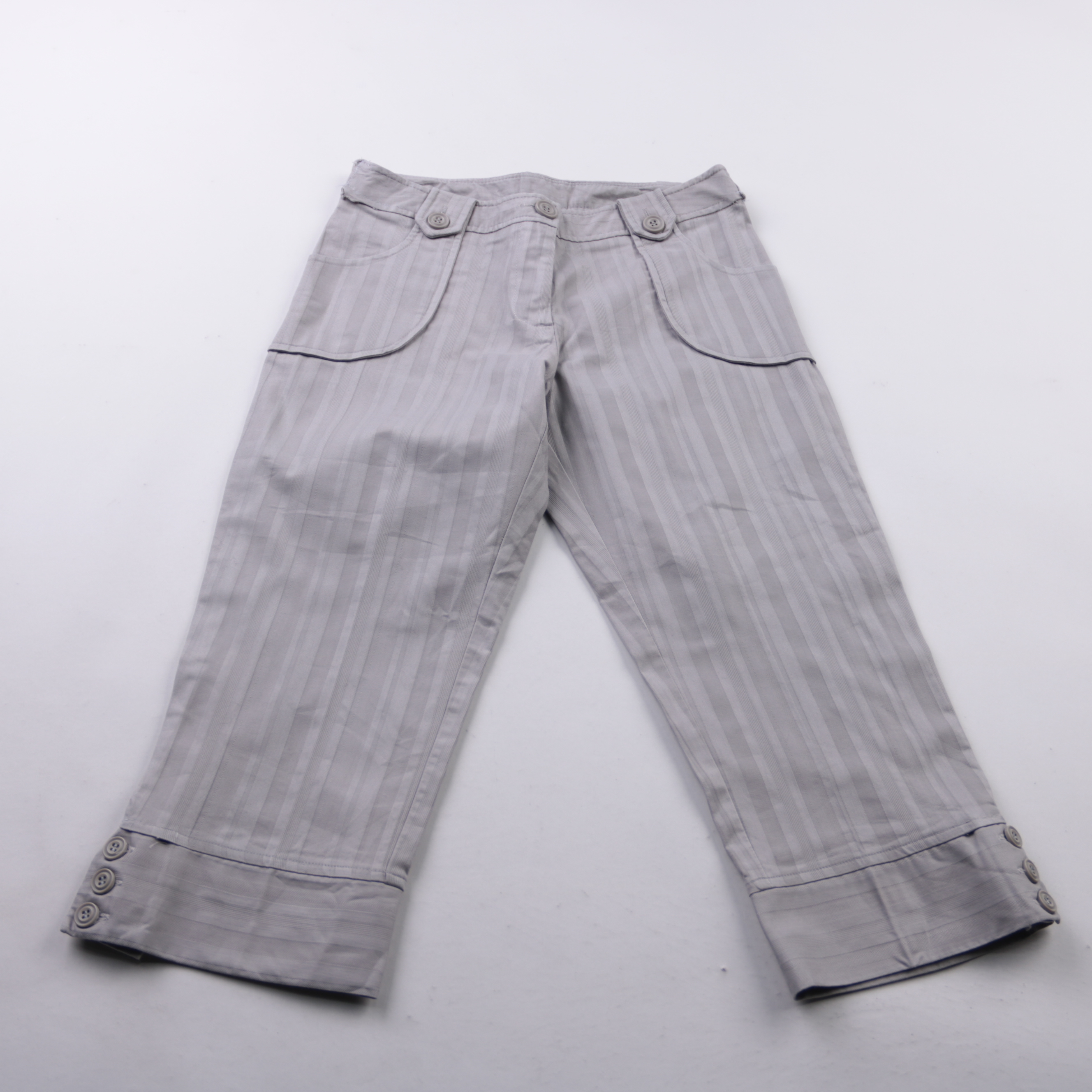 Брюки Florence+Fred светло-серого цвета в тонкую полоску, с крупными накладными карманами и манжетами на пуговицах. Подойдут для повседневных образов и офиса в стиле casual, хорошо сочетаются с рубашками и базовыми топами. Ткань с эластаном немного тян...