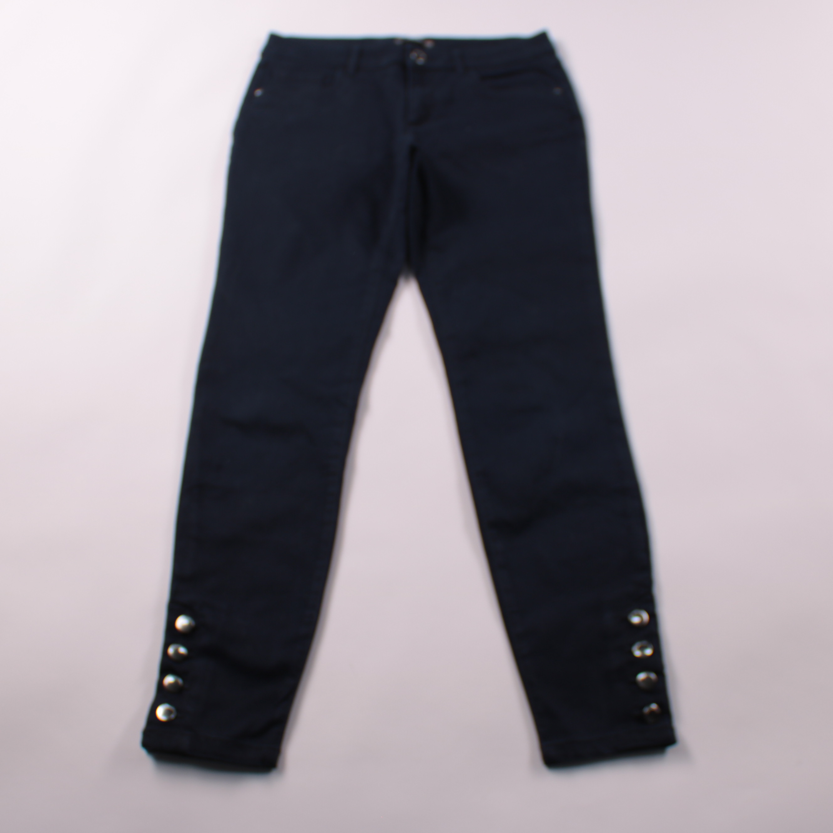 Женские брюки Orsay тёмно-синего цвета с застёжкой на молнию и пуговицу и декоративными кнопками по низу штанин. Подойдут для офиса и повседневных образов с рубашкой, водолазкой или жакетом. Плотная ткань держит форму и выглядит аккуратно в течение дня.