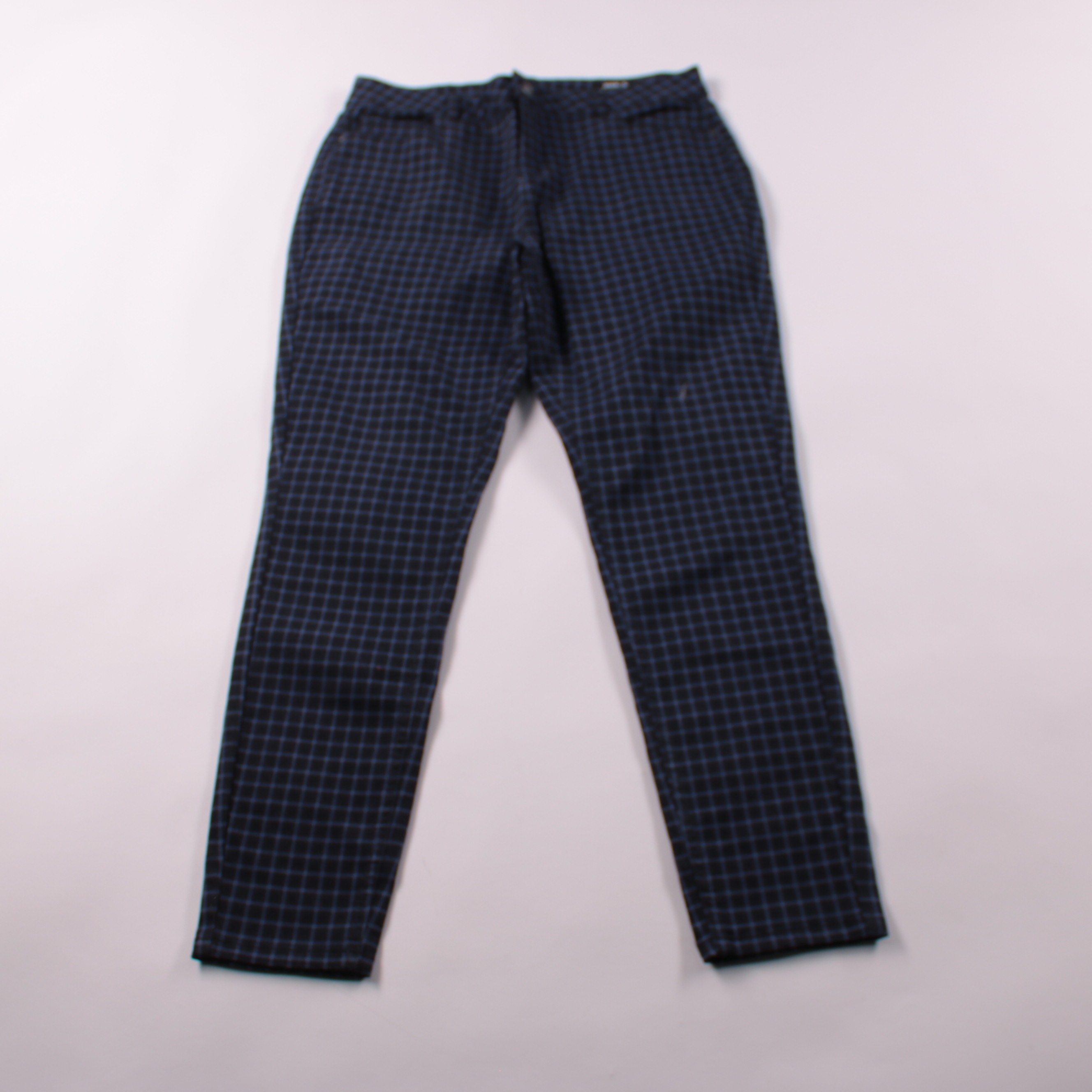 Женские брюки Tu модели skinny в тёмно-синюю клетку. Подойдут для повседневных и офисных образов, хорошо сочетаются с однотонными рубашками и свитерами. Хлопковая ткань со стрейчем комфортно тянется и держит форму.