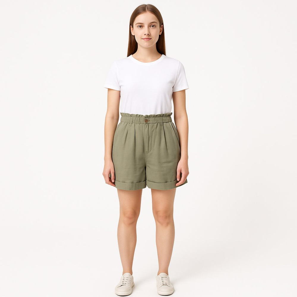 Женские шорты AMISU цвета хаки с высокой посадкой и эластичным поясом. Подойдут для лета и тёплой весны, легко сочетаются с футболками и топами. Пояс на резинке делает посадку комфортной и не сковывает движения.