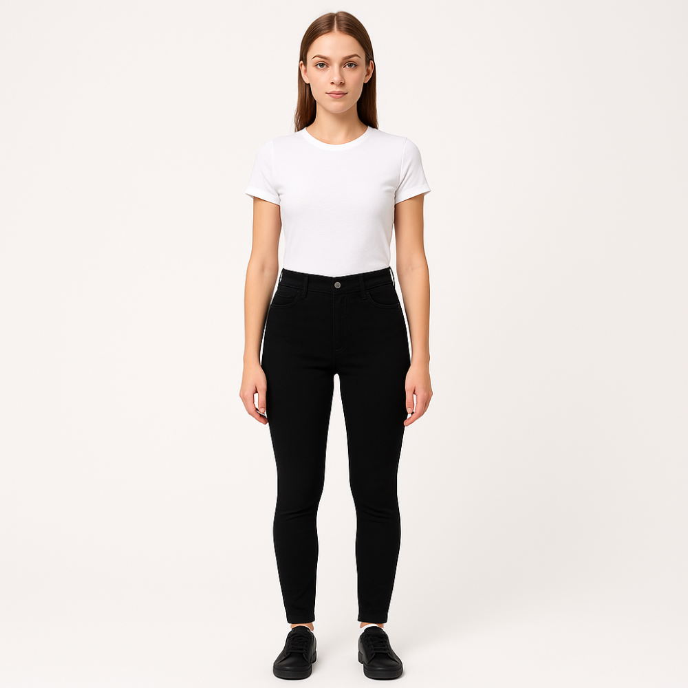 Женские облегающие брюки Denim Co. в базовом чёрном цвете с классической посадкой и карманами. Подойдут для повседневных образов и офиса в стиле casual, легко сочетаются с футболками и рубашками. Практичный плюс — эластичная посадка и немаркий цвет.
