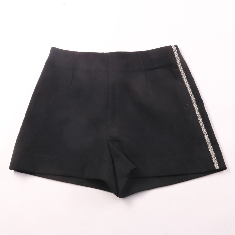 Женские шорты Zara Basic чёрного цвета с высокой посадкой и декоративной полосой из страз сбоку. Подойдут для летних прогулок и вечерних выходов, легко сочетаются с топами и жакетами. Ткань со стрейчем комфортно садится по фигуре и не сковывает движения.