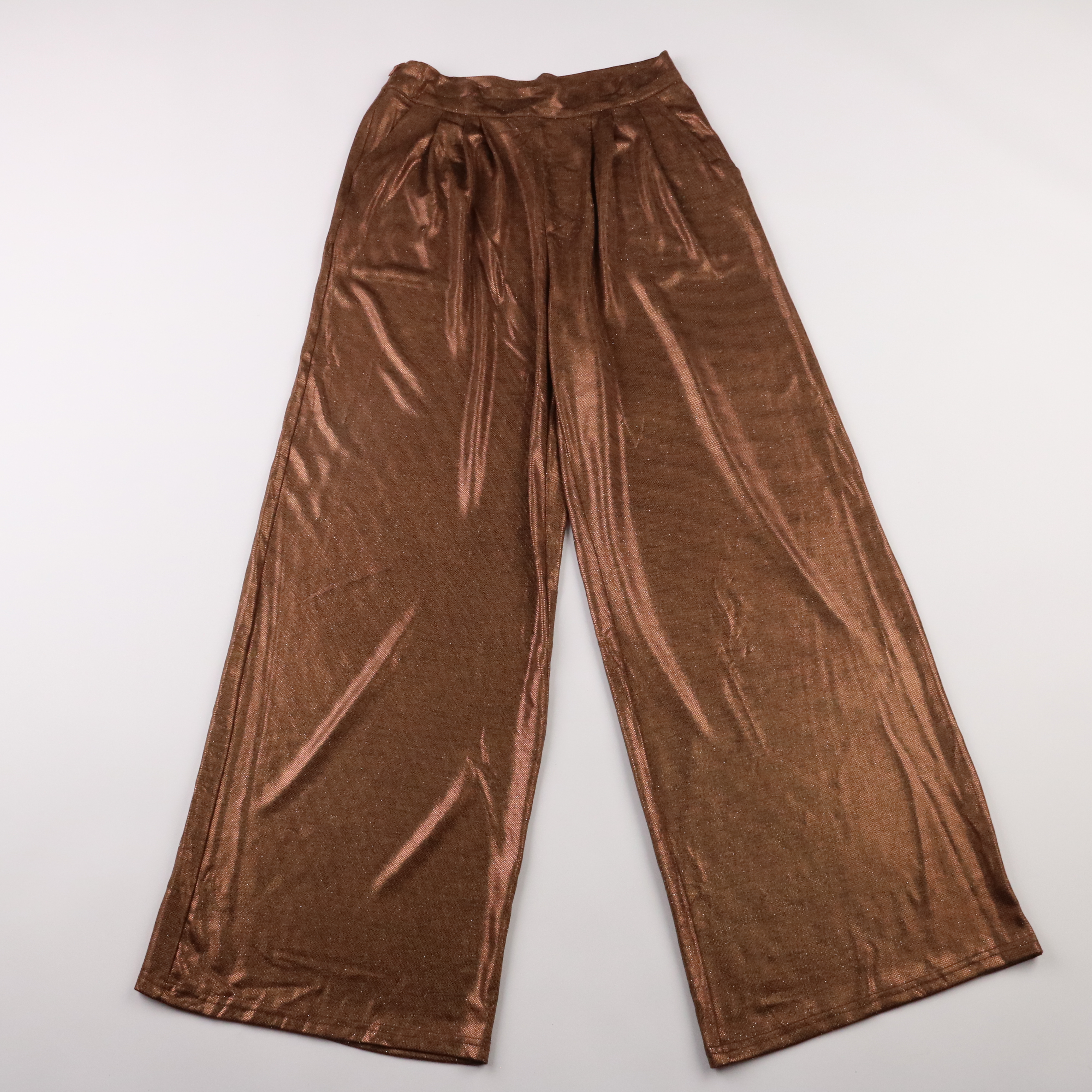 Женские брюки палаццо с высокой посадкой и мягкими складками у пояса, выполнены из блестящей ткани бронзово-коричневого оттенка. Подойдут для вечерних выходов и образов в стиле casual chic, легко сочетаются с однотонными топами и жакетами. Материал с д...