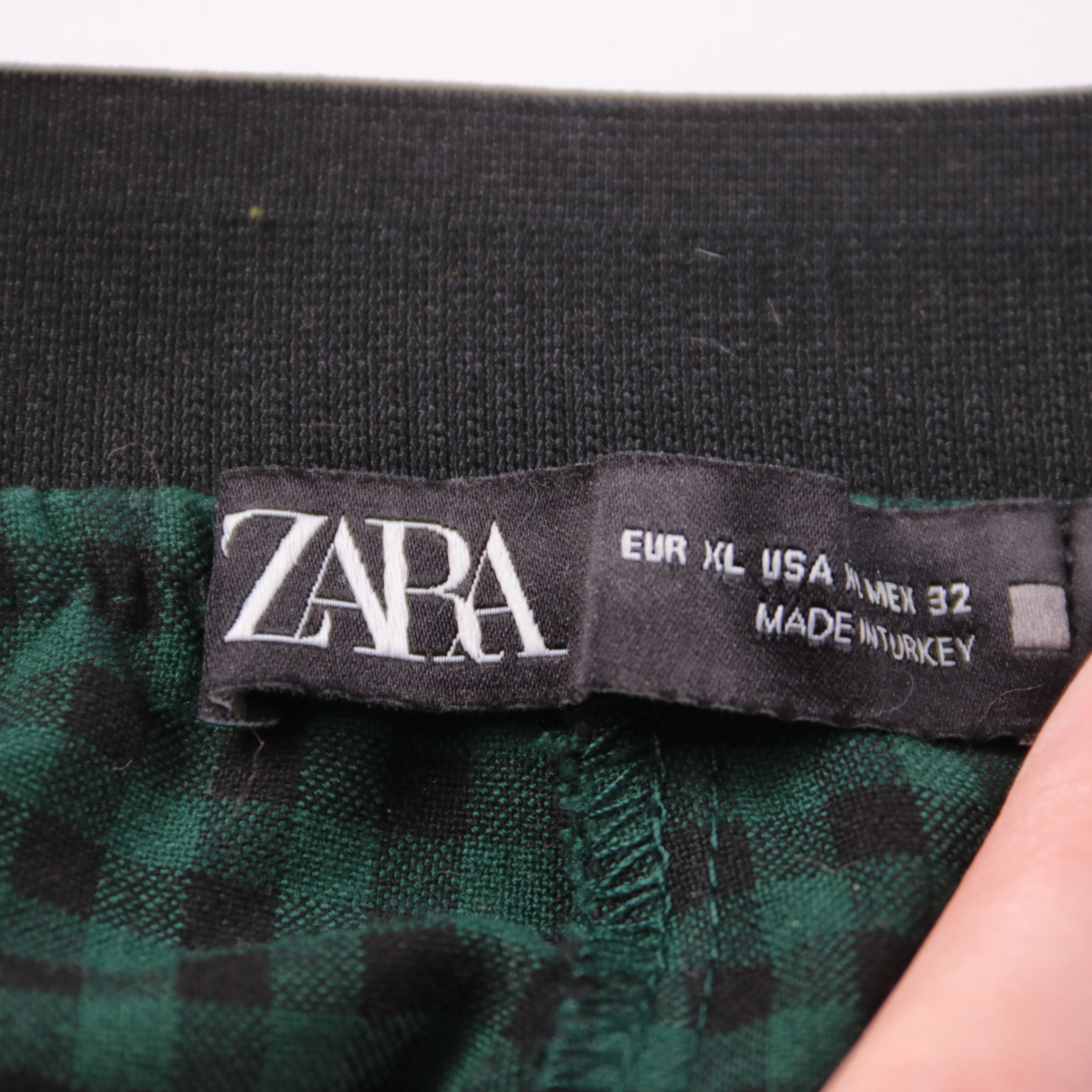 Женские брюки Zara в зелёно-чёрную клетку, прямого кроя с высокой посадкой. Подойдут для офиса и повседневных образов с базовыми футболками, рубашками или жакетом. Плотная ткань держит форму и выглядит аккуратно в течение дня.
