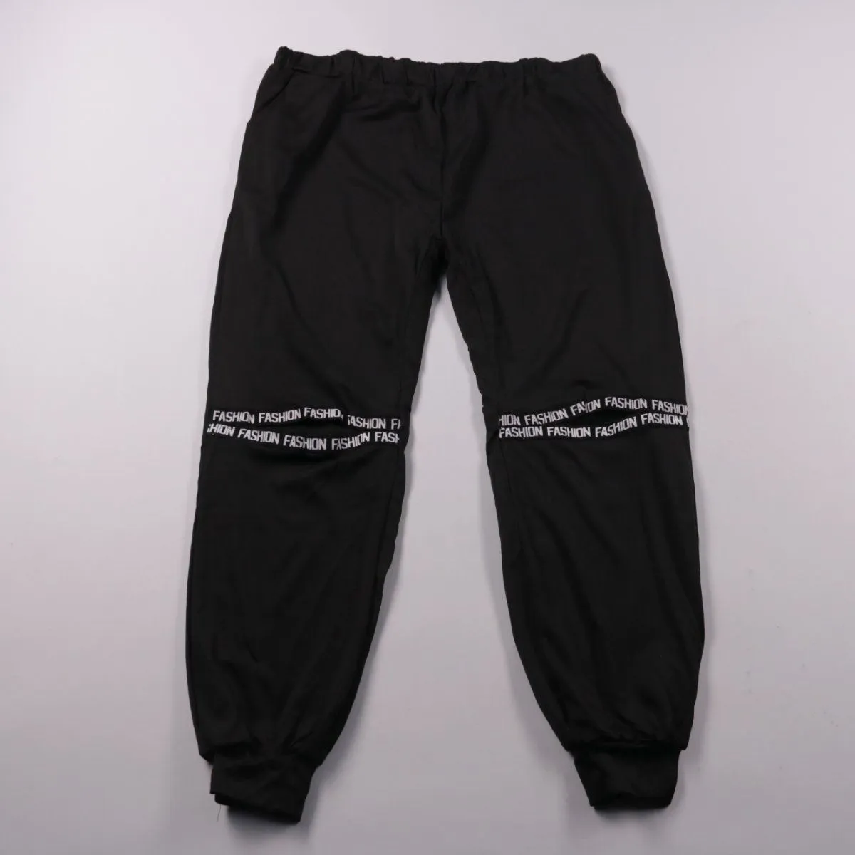 Чёрные брюки-джоггеры с эластичным поясом и манжетами по низу, с декоративной надписью «FASHION» на уровне колен. Подойдут для прогулок и повседневной носки в стиле casual/спорт. Ткань с добавлением спандекса немного тянется и комфортна в движении.