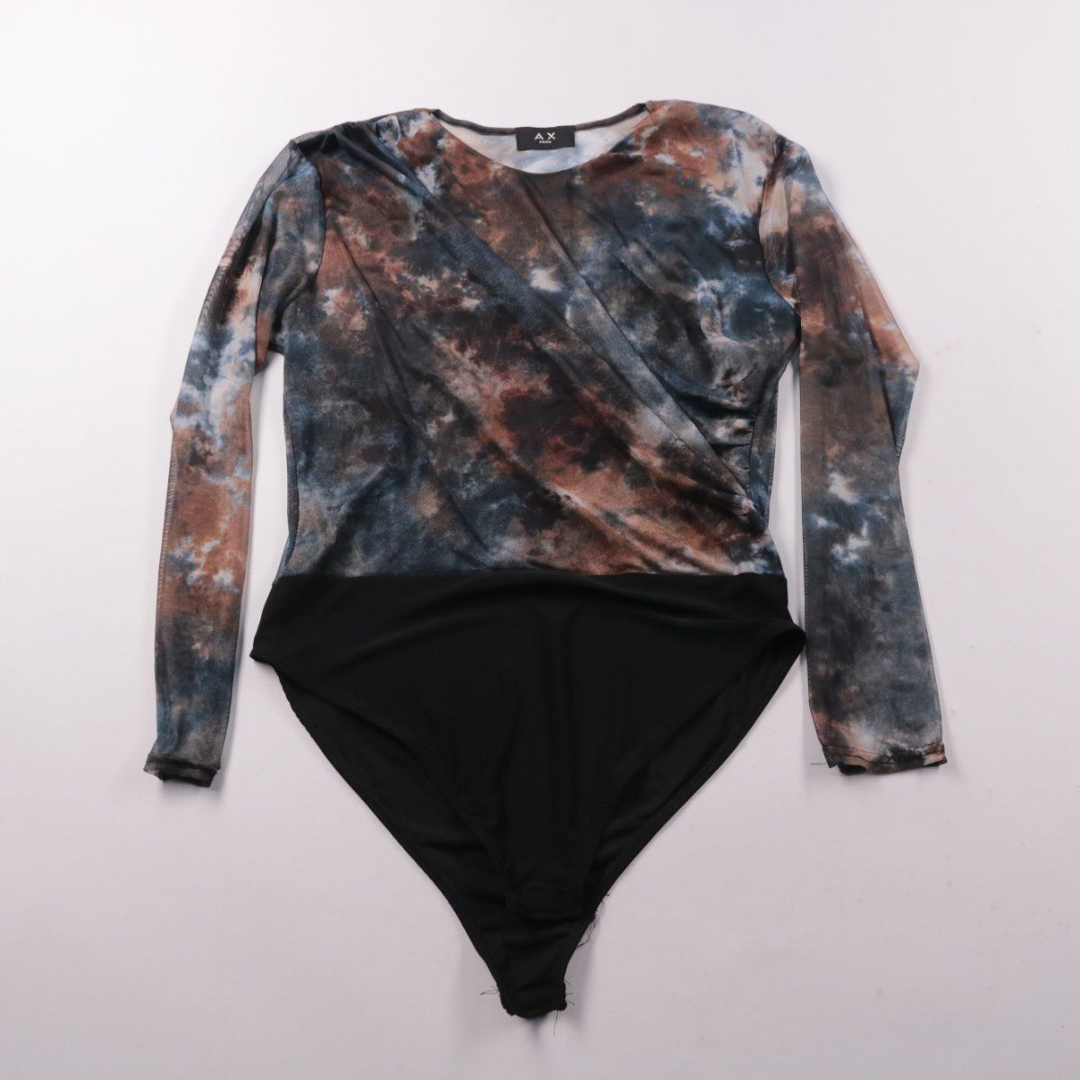 Женское боди AX Paris с длинным рукавом и абстрактным принтом в сине-коричневых оттенках, с чёрной нижней частью. Подойдёт для образов на выход и в качестве базового слоя под жакет или кардиган. Эластичная ткань хорошо тянется и удобна в носке.
