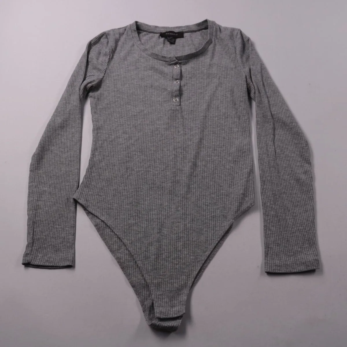 Женское боди Primark из серого трикотажа в рубчик, с длинным рукавом и застёжкой на пуговицы у горловины. Подойдёт для повседневных образов и как базовый слой в прохладную погоду. Эластичный материал хорошо тянется и комфортно сидит по фигуре.