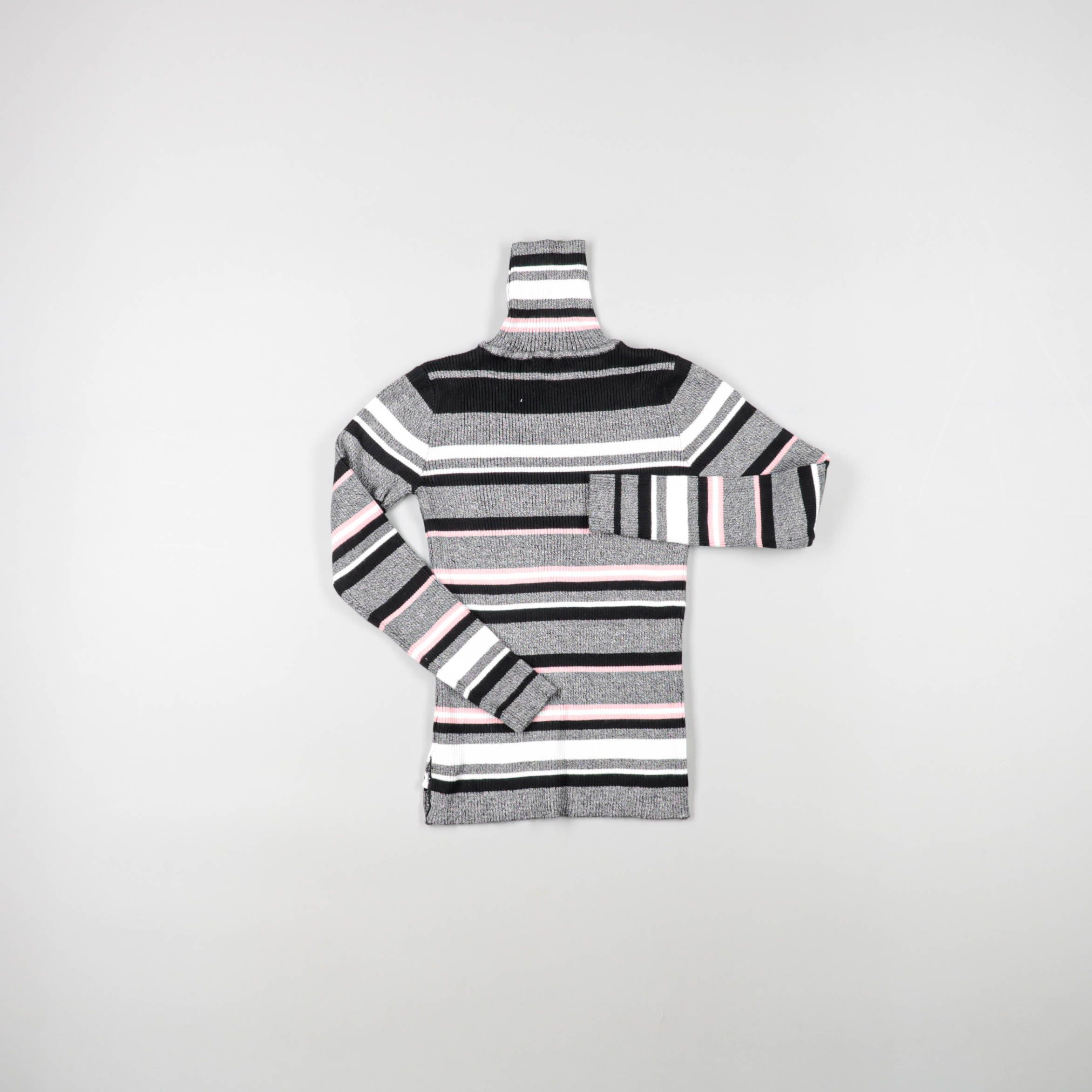 Женская водолазка в серую основу с горизонтальными полосками чёрного, белого и розового цветов и высоким воротником-стойкой. Подойдёт для повседневных образов на осень/весну и для офиса с базовыми брюками или джинсами. Трикотаж тянется и комфортно сади...