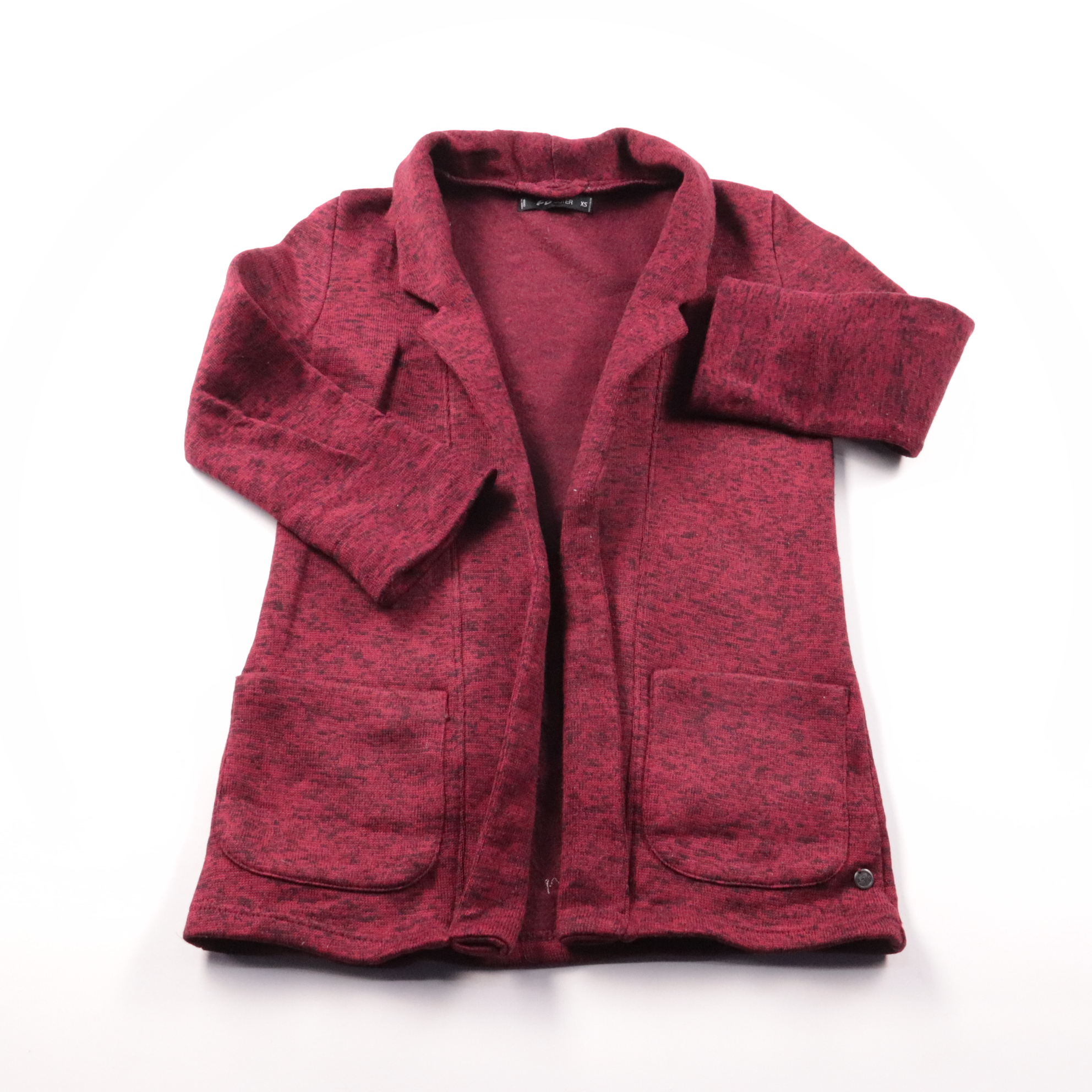 Кардиган FB Sister из плотного трикотажа бордового меланжа, размер XS. Модель без застёжки с накладными карманами, удобно накинуть поверх топа или платья в прохладную погоду. Практичный материал не мнётся и быстро сохнет.