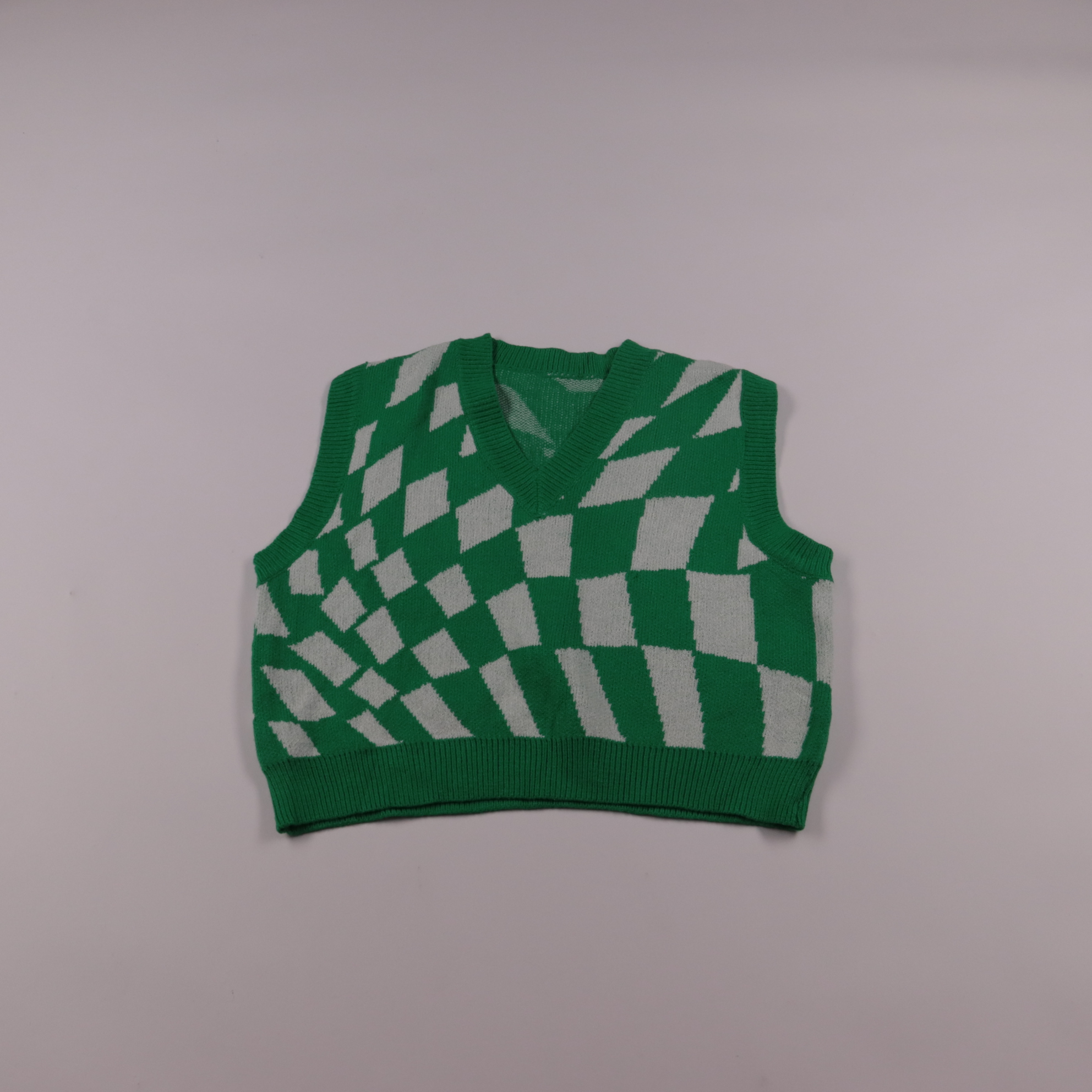 Вязаный жилет Shein зелёно-белого цвета с V-образным вырезом и графичным узором. Подойдёт для повседневных образов поверх рубашки или лонгслива в прохладную погоду. Лёгкий и не стесняет движения, удобно комбинировать с джинсами и юбками.