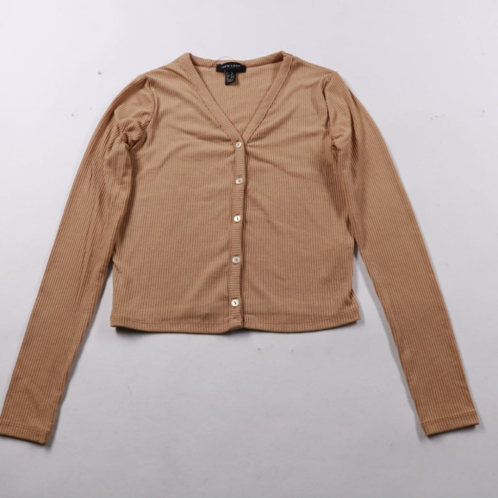 Кардиган New Look из мягкого трикотажа-лапши бежевого цвета, с V‑вырезом и застёжкой на пуговицы. Подойдёт для повседневных образов и офисных комплектов в прохладную погоду. Тянется и удобно садится по фигуре, легко сочетать с топами и платьями.