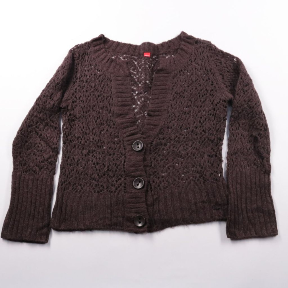 Вязаный кардиган S.Oliver шоколадно-коричневого цвета с ажурной вязкой и V‑образным вырезом, застёгивается на пуговицы. Подойдёт для повседневных образов в прохладные дни, удобно носить поверх топа или водолазки. Лёгкий материал и манжеты в рубчик держ...