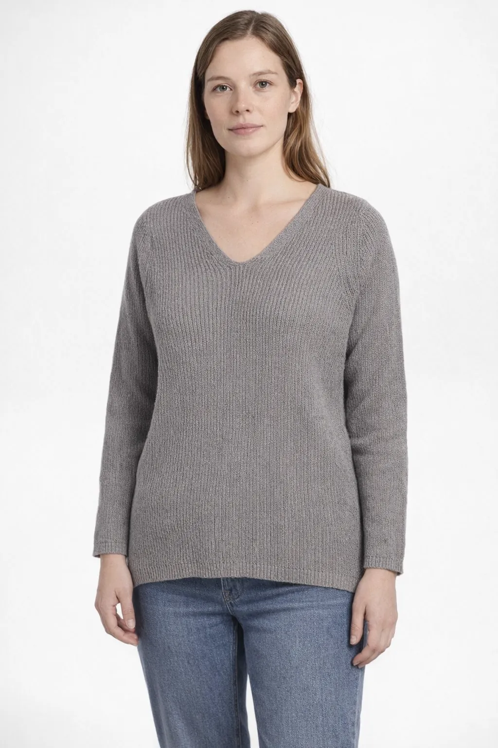 Женский вязаный джемпер с V-образным вырезом и длинным рукавом, фактурная вязка в рубчик. Подойдёт для повседневных образов на работу или прогулки, легко сочетается с джинсами и брюками. Практичен тем, что мягкий и удобный, не стесняет движений.