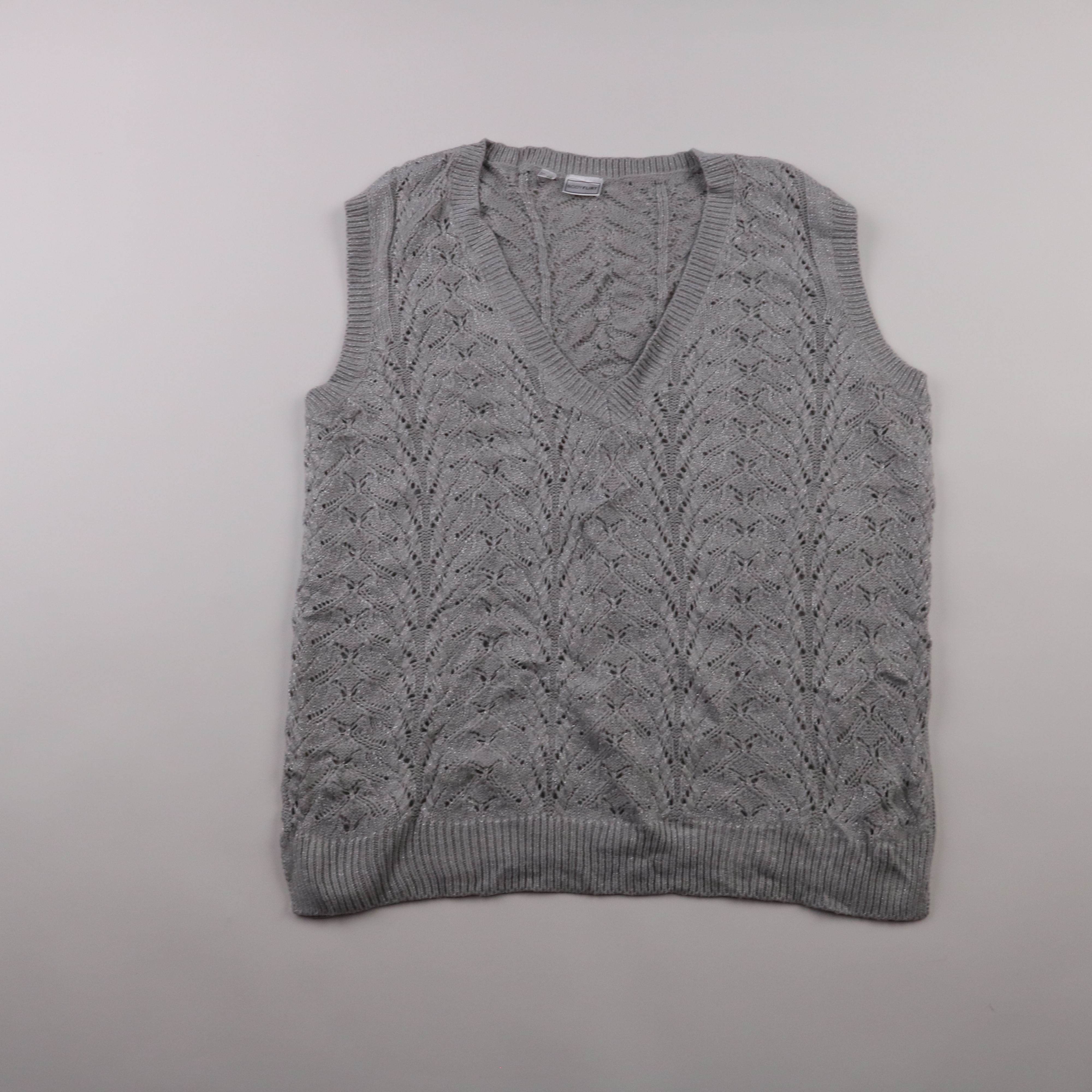 Вязаный жилет Bodyflirt серого цвета с ажурным узором и V‑образным вырезом. Удобно носить поверх рубашки или лонгслива в офис и на каждый день. Лёгкий материал со сдержанным блеском не мнётся и быстро сохнет.