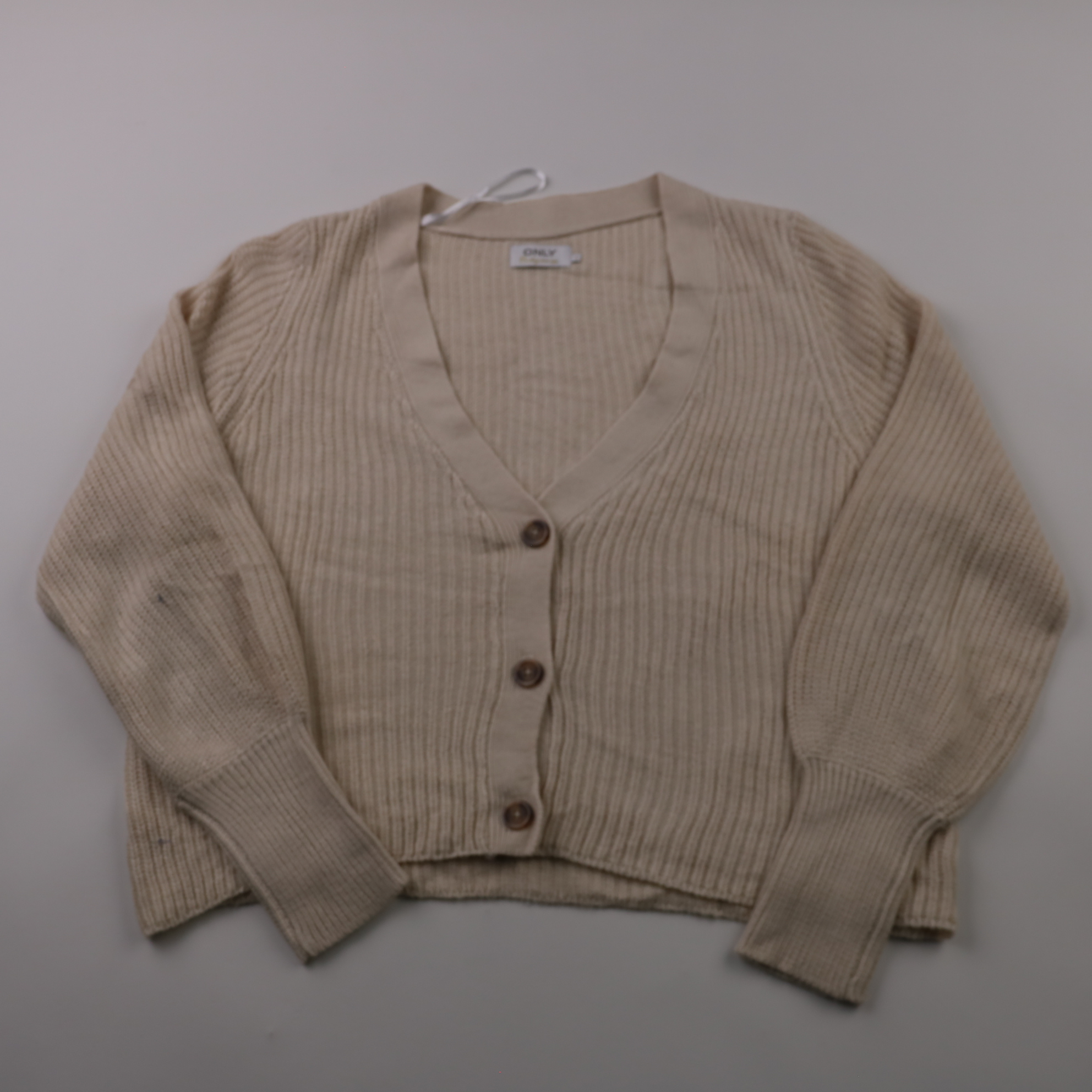 Женский трикотажный кардиган ONLY укороченного кроя, в рубчик, с V‑вырезом и застёжкой на пуговицы. Подойдёт для повседневных образов и в офис, удобно носить как второй слой на топ или платье. Практичный базовый бежевый цвет легко сочетать с джинсами и...