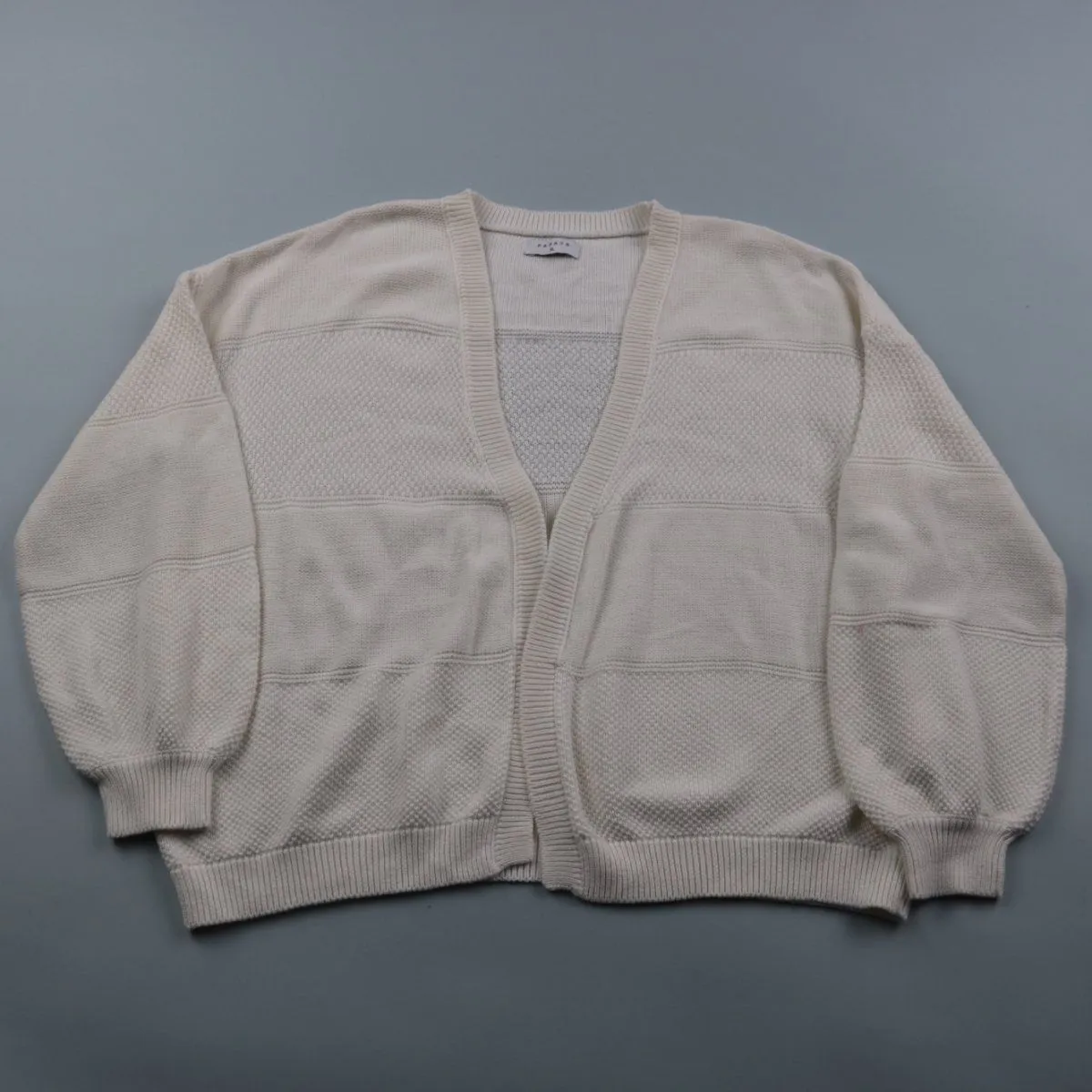Вязаный кардиган Papaya молочного цвета с V-образным вырезом и фактурной вязкой полосами. Подойдёт для повседневных образов в прохладную погоду, удобно носить поверх топа или водолазки. Мягкая хлопково-акриловая пряжа хорошо держит форму и проста в уходе.
