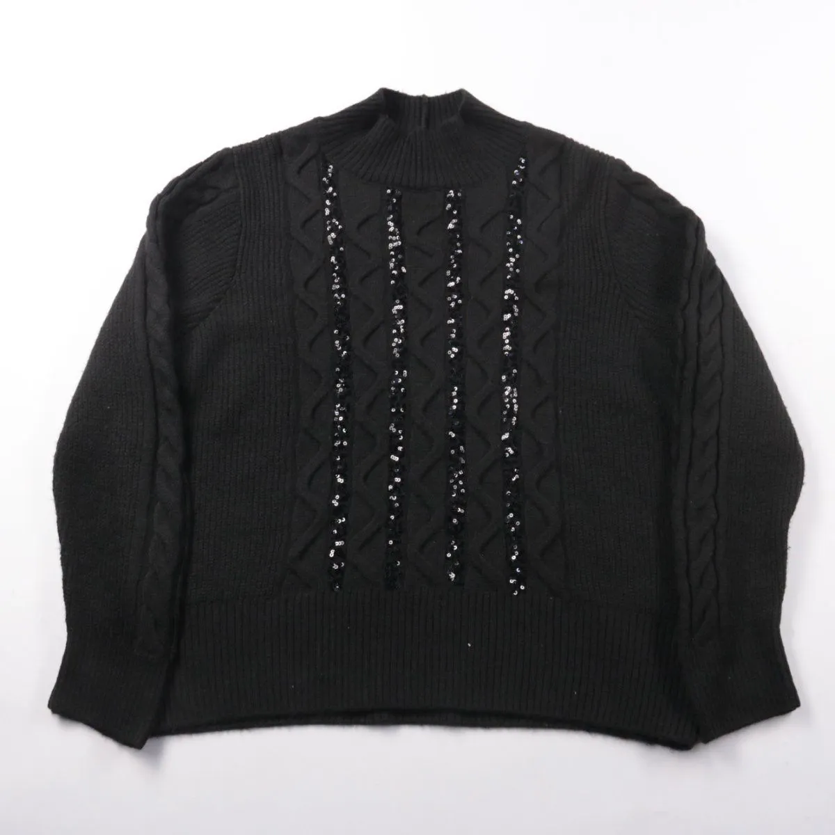 Вязаный свитер George чёрного цвета с высоким воротом и узором «косы», спереди декорирован вертикальными полосами пайеток. Подойдёт для прохладной погоды и повседневных образов с джинсами или юбкой. Плотная вязка хорошо держит форму и даёт дополнительное тепло.