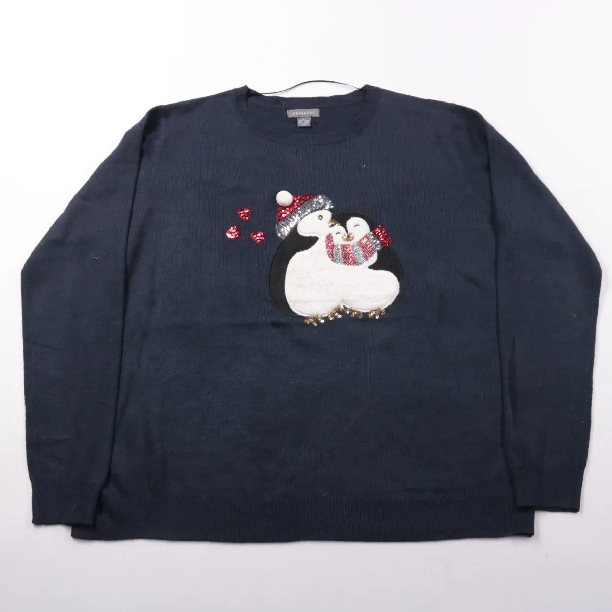 Женский джемпер Primark тёмно-синего цвета с новогодней аппликацией пингвинов и декором пайетками. Подойдёт для зимних прогулок, праздников и уютных домашних образов. Материал акрил — лёгкий в уходе и быстро сохнет после стирки.