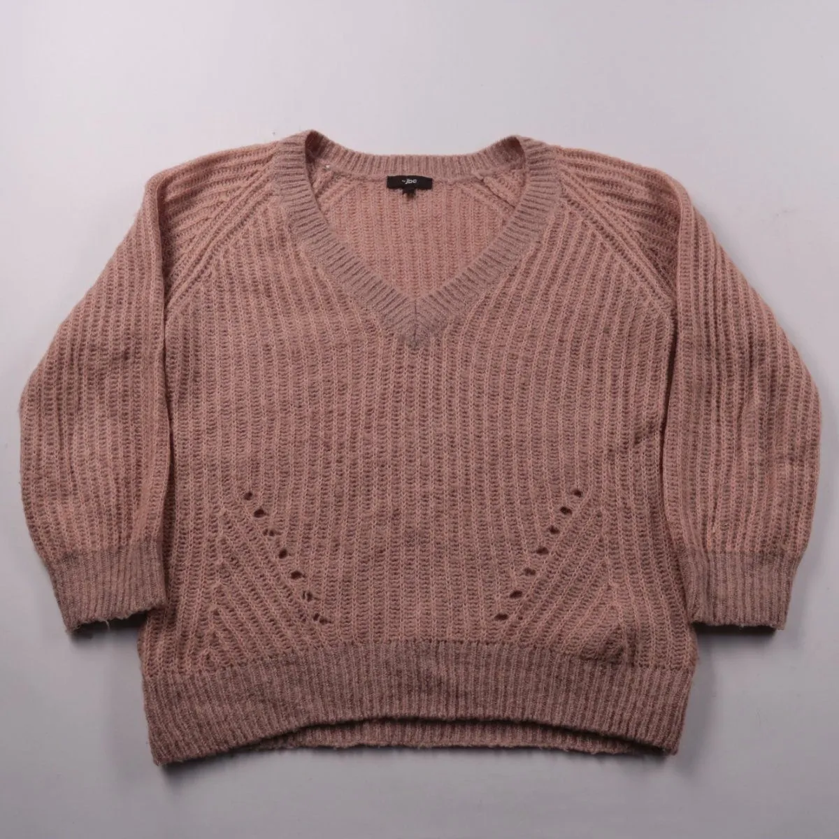 Женский вязаный джемпер JBC пудрово-розового цвета с V-образным вырезом и фактурной вязкой. Подойдёт для повседневных образов в прохладную погоду, хорошо сочетается с джинсами и юбками. Смесовая пряжа с мохером делает изделие тёплым и мягким.