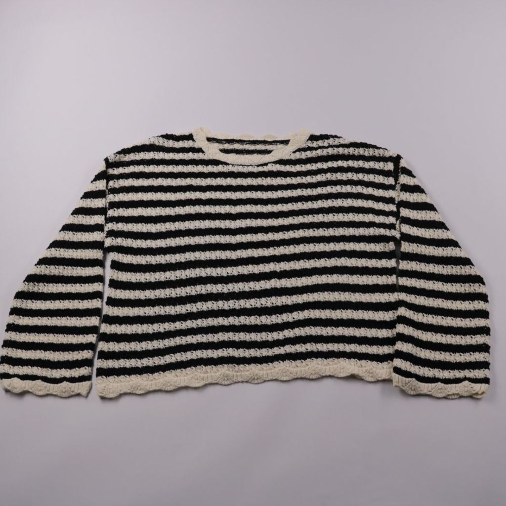 Вязаный джемпер в чёрно-белую полоску с круглым вырезом и длинными рукавами. Подойдёт для повседневных образов в прохладную погоду, хорошо сочетается с джинсами и однотонными юбками. Практичное преимущество — плотная фактурная вязка хорошо держит форму.