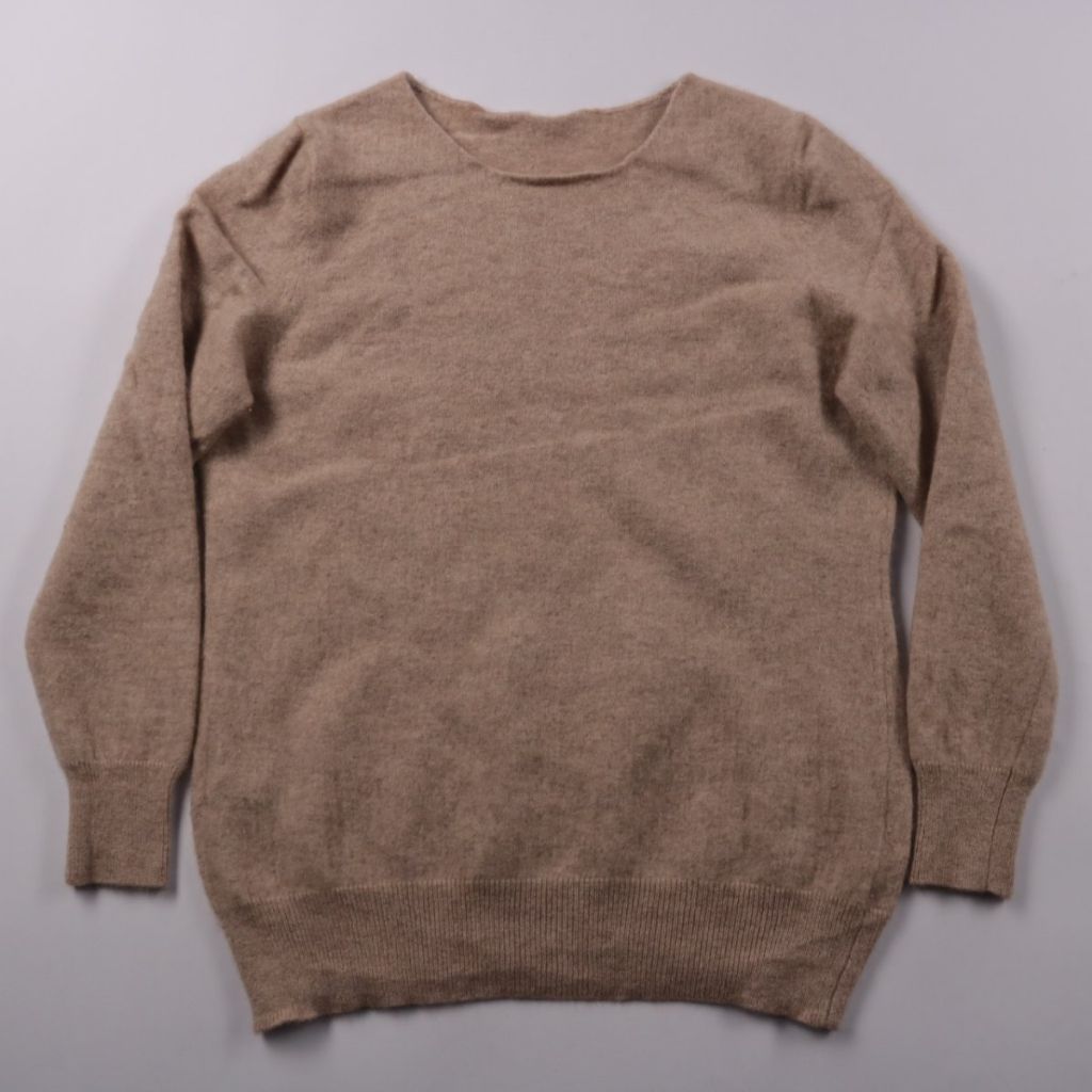 Вязаный джемпер без бренда, бежевого меланжевого цвета, с круглым вырезом и манжетами на рукавах. Подойдёт для повседневных образов и офиса в прохладную погоду. Практичен тем, что легко сочетается с джинсами, брюками и юбками.