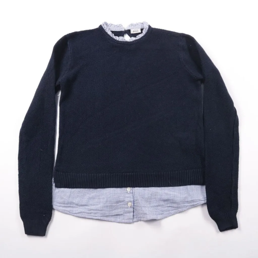 Женский джемпер Pimkie тёмно-синего цвета с эффектом «рубашки»: из-под низа и у горловины видна полосатая вставка. Подойдёт для повседневных образов в офис, учёбу или на прогулку в прохладную погоду. Практичен тем, что создаёт многослойный вид без лишн...