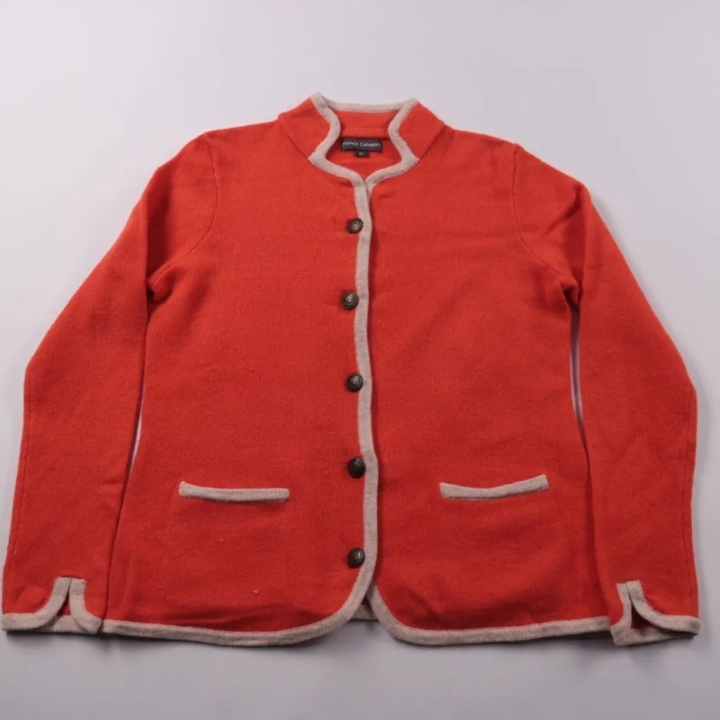 Кардиган Franco Callegari красного цвета с контрастной бежевой окантовкой и застёжкой на пуговицы, есть накладные карманы. Подойдёт для повседневных образов в прохладную погоду, удобно носить поверх топа или водолазки. Натуральная шерсть хорошо сохраня...