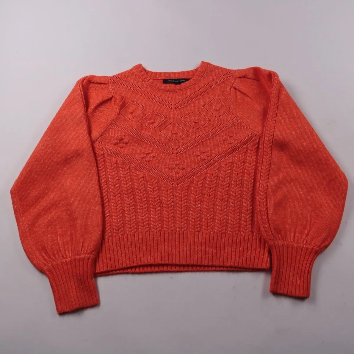 Вязаный джемпер French Connection кораллово-оранжевого цвета с фактурным узором на груди и объёмными рукавами. Подойдёт для прохладной погоды и многослойных образов с джинсами или юбкой. Мягкая пряжа с добавлением шерсти хорошо держит тепло.