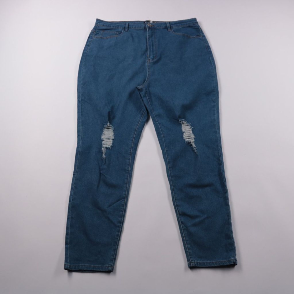 Женские джинсы Boohoo Blue синего цвета с декоративными потертостями на штанинах. Подойдут для повседневных образов с кроссовками или ботинками в любое время года. Практичный плюс — плотный деним со стрейчем, удобны в носке и лучше держат посадку.