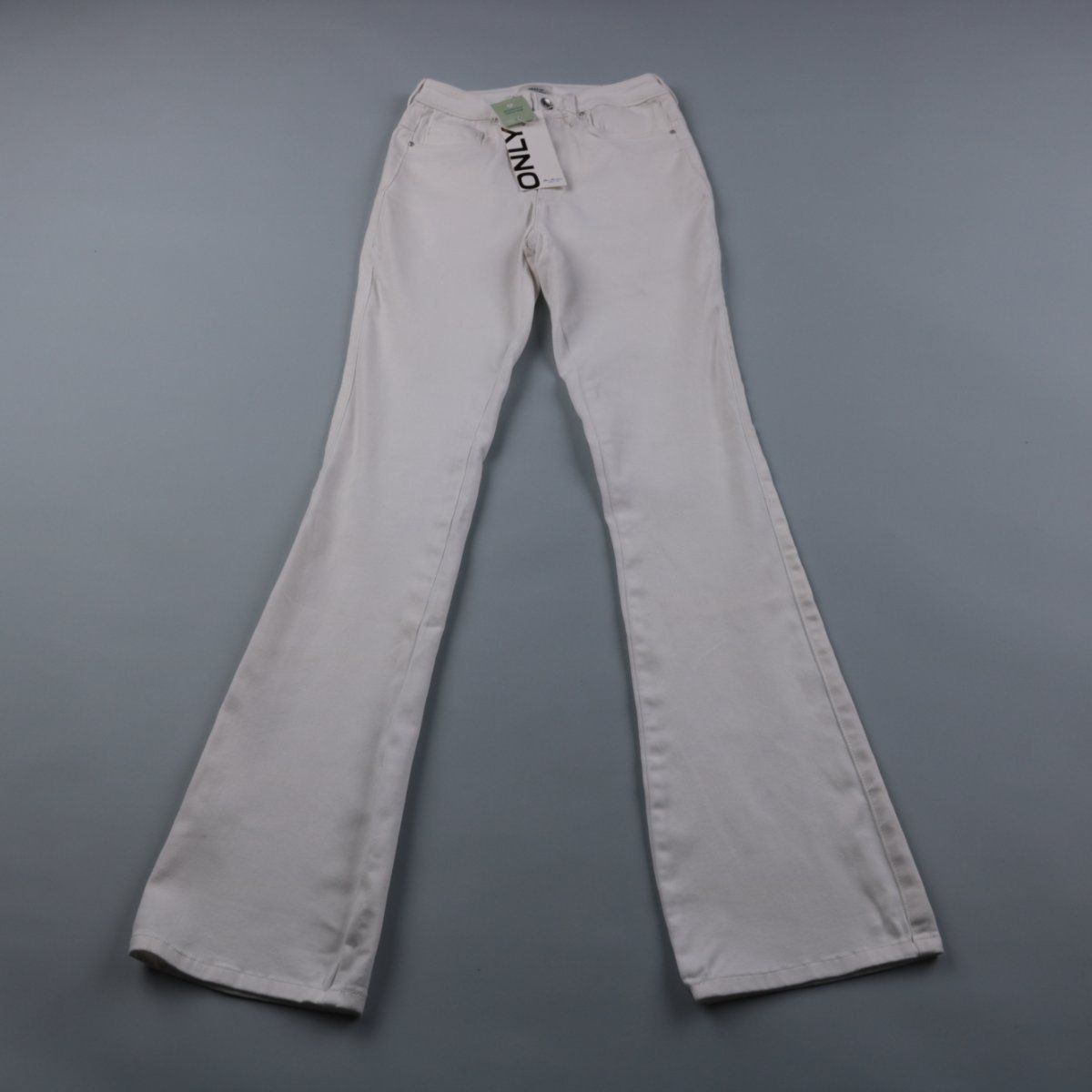 Женские белые джинсы ONLY расклешённого кроя с высокой посадкой. Подойдут для повседневных образов и летних комплектов благодаря светлому цвету. Ткань со стрейчем, поэтому модель комфортнее садится по фигуре.